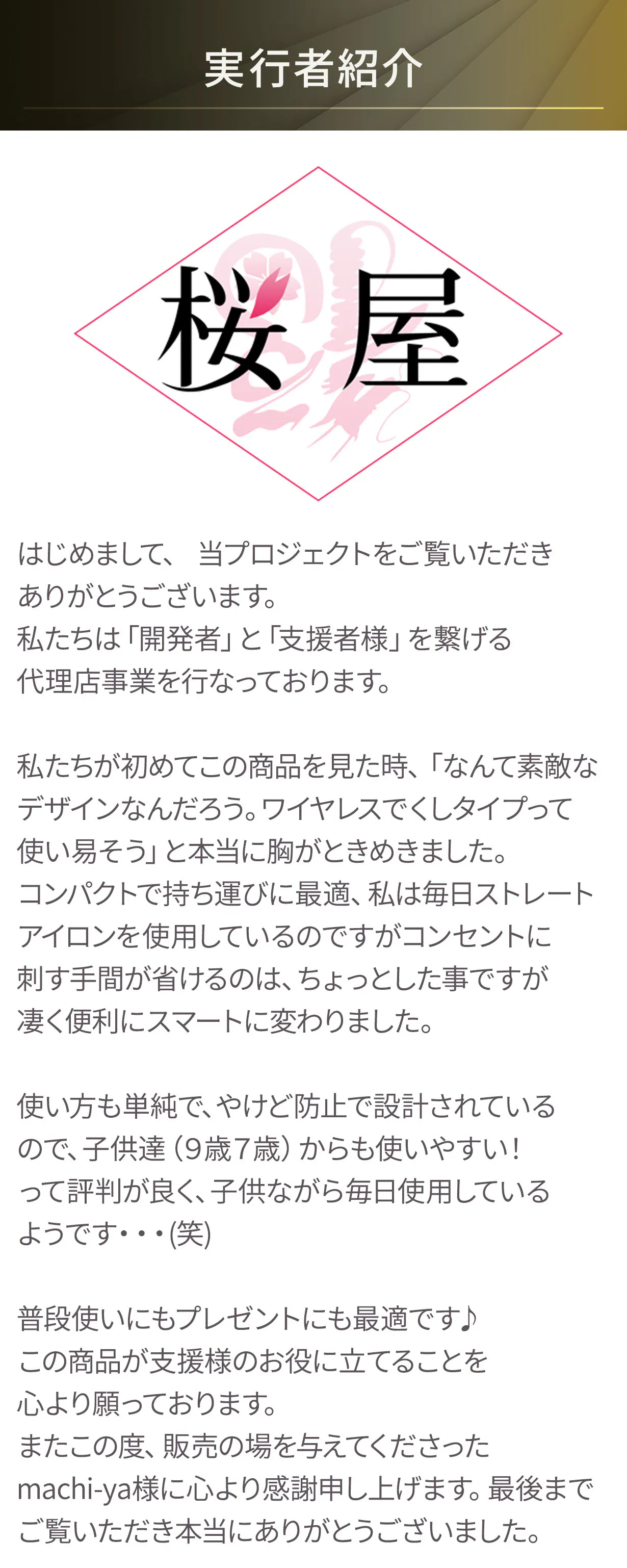 【免責事項】本製品使用によるトラブルについては一切の責任を負いかねますので、ご了承ください。クラウドファンディングを経て製造を行う性質上、以上の注意点につきまして予めご理解とご了承をいただいた上でご支援くださいますよう、何卒よろしくお願い申し上げます。 最後に、本製品を受け取られた皆様に喜んでもらえるよう、SAKURAYA_MIIKOのチームメンバー一同、心を込めて対応して参りますので、 応援の程、よろしくお願い致します。