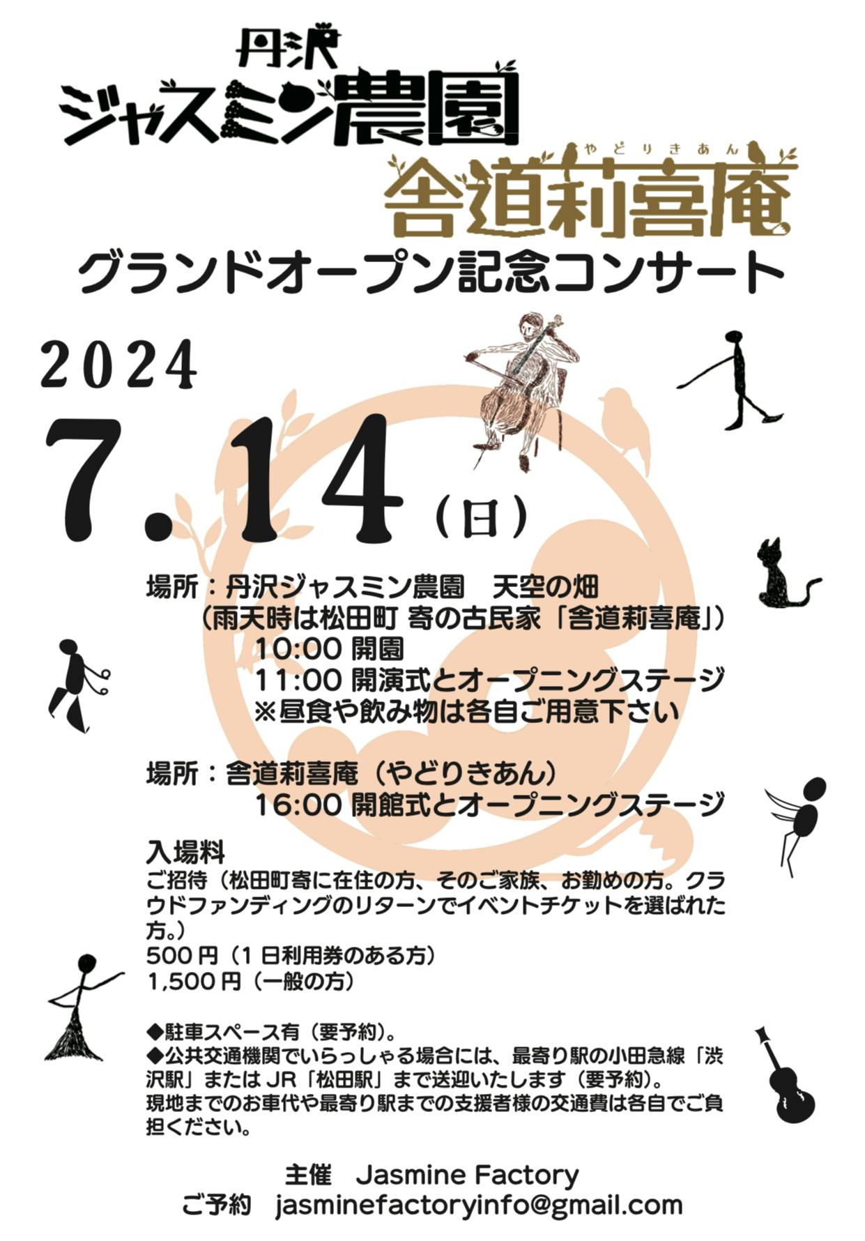2024/07/02 03:47【グランドオープン記念コンサート】を開催いたします!!イベント等参加チケットの含まれるリターンを選んだ方は、イベントチケットのみでご利用いただけます^ ^!農園または舎道莉喜庵の一日利用券のある方は、追加料金500円でご利用いただけます^ ^!チケットの郵送が間に合わなかった場合、リストにて管理させていただきます^ ^◆ 7月14日(日)丹沢ジャスミン農園★「グランドオープン記念コンサート」 日時:2024年7月14日 場所:丹沢ジャスミン農園 天空の畑 (雨天時は松田町寄の古民家「舎道莉喜庵」) 10:00 開園 11:00 開演式とオープニングステージ ※昼食や飲み物は各自ご用意下さい 場所:舎道莉喜庵(やどりきあん) 16:00 開館式とオープニングステージ入場料無料ご招待:八沢、寄にお住まいの方、クラウドファンディングで1日利用チケットが含まれるリターンを選ばれた方(当日に限り、庵と天空の畑の2箇所共通で使えます)1日利用券のある方:500円の追加料金一般の方:1,500円◆駐車スペース有(要予約)。◆公共交通機関でいらっしゃる場合には、最寄り駅の小田急線「渋沢駅」またはJR「松田駅」まで送迎いたします。要予約現地までのお車代や最寄り駅までの支援者様の交通費は各自でご負担ください。◆出演者ゲスト加藤道行 舞踏野村雅美 ソロギター服部雅好 ピアノ他民族音楽森川信子 左手のピアニスト早坂眞子 左手のピアニスト力武誠 打楽器パーカッション(ドラム)横田朋子 シンギングボウル 他MICHIKO ボーカル二神基 ドラム(パーカッション)布川賢一 ベースJUN ギター吉田由香 バリアフリーダンスJasmine Factoryより莉玲 歌、手話、ダンス、楽器など北條立記 チェロKaori 手話パフォーマンス もっと見る