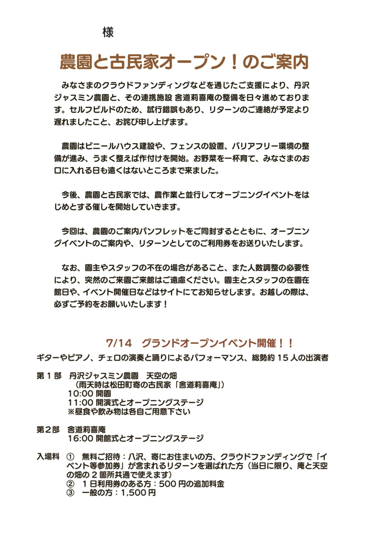 2024/07/06 10:19【クラファン支援者の皆様へ】農園と古民家のリーフレットとともにこちらのお手紙とリターンの発送準備しております各種チケットを該当者に同封させていただきます。7/14には間に合うと思うのですが、、、!間に合わない場合はリストにて対応させていただきますご来園いただける方はご来園方法 または 送迎の希望などをお知らせください^ ^!!当日の駐車場は確保しておりますが台数の把握と送迎スケジュールを立てたいと思いますよろしくお願いいたします^ ^以下、お手紙の内容です農園と古民家オープン!のご案内 みなさまのクラウドファンディングなどを通じたご支援により、丹沢ジャスミン農園と、その連携施設 舎道莉喜庵の整備を日々進めております。セルフビルドのため、試行錯誤もあり、リターンのご連絡が予定より遅れましたこと、お詫び申し上げます。 農園はビニールハウス建設や、フェンスの設置、バリアフリー環境の整備が進み、うまく整えば作付けを開始。お野菜を一杯育て、みなさまのお口に入れる日も遠くはないところまで来ました。 今後、農園と古民家では、農作業と並行してオープニングイベントをはじめとする催しを開始していきます。 今回は、農園のご案内パンフレットをご同封するとともに、オープニングイベントのご案内や、リターンとしてのご利用券をお送りいたします。 なお、園主やスタッフの不在の場合があること、また人数調整の必要性により、突然のご来園ご来館はご遠慮ください。園主とスタッフの在園在館日や、イベント開催日などはサイトにてお知らせします。お越しの際は、必ずご予約をお願いいたします!7/14 グランドオープンイベント開催!!ギターやピアノ、チェロの演奏と踊りによるパフォーマンス、総勢約15人の出演者第1部 丹沢ジャスミン農園 天空の畑 (雨天時は松田町寄の古民家「舎道莉喜庵」) 10:00 開園 11:00 開演式とオープニングステージ ※昼食や飲み物は各自ご用意下さい第2部 舎道莉喜庵 16:00 開館式とオープニングステージ入場料① 無料ご招待:八沢、寄にお住まいの方、クラウドファンディングで「イベント等参加券」が含まれるリターンを選ばれた方(当日に限り、庵と天空の畑の2箇所共通で使えます)② 1日利用券のある方:500円の追加料金③ 一般の方:1,500円アクセスについてご送迎農園、古民家ともに、最寄駅 小田急線「渋沢駅」またはJR御殿場線「松田駅」までご送迎いたします。送迎ご希望の方はご連絡をください。お車で直接お越しの方農園と古民家いずれも駐車スペースがあります(要予約)。なお、お車代、最寄り駅までの交通費はみなさまの方でご負担ください。丹沢ジャスミン農園にお越しの方乗合自動車 農園にお越しの際にご利用いただけます。*舎道莉喜庵へは行けません。「上地区乗合自動車「行け行けぼくらのかみちゃん号」(秦野市)ご利用方法 「渋沢駅北口」で乗車し「上公⺠館駐車場前」「上公民館前」で下車 上公民館からご連絡いただければ、車で3分ほどで迎えに伺いますダイヤ 平日のみ運行 渋沢駅北口→上公民館 発車時間7:10 7:55 9:30 11:40 13:10(その他)上公民館→渋沢駅北口 発車時間7:43 8:28 9:51 12:13 13:31 14:33 16:01 16:58 18:36料金 大人200円〜300円 小児100円 未就学児2人まで無料舎道莉喜庵にお越しの方路線バス(東急モビリティ)1 長寿橋(舎道莉喜庵近くのバス停)新松田駅→長寿橋 平日2本のみ(土日祝運行なし) 発車時間16:05 19:15長寿橋→新松田駅 平日2本のみ(土日祝運行なし) 発車時間7:59 11:392 田代向(舎道莉喜庵から徒歩26分ほどのバス停)新松田駅→田代向 平日13便 土日祝8便田代向→新松田駅 平日13便 土日祝8便乗合バス「のるーと足柄」舎道莉喜庵にお越しの際にご利用いただけます。丹沢ジャスミン農園には行けません。専用アプリ「のるーと足柄」または電話(0120-303-062 受付時間 9:00〜17:00)により、配車リクエストが可能です。1 乗るところ「松田駅周辺146番 JR松田駅」または「新松田駅南側246(180)番 新松田駅南口(東向き)」2 降りるところ「寄地区南側39(40)番 長寿橋(西向き)」料金 大人300円 小人100円 もっと見る