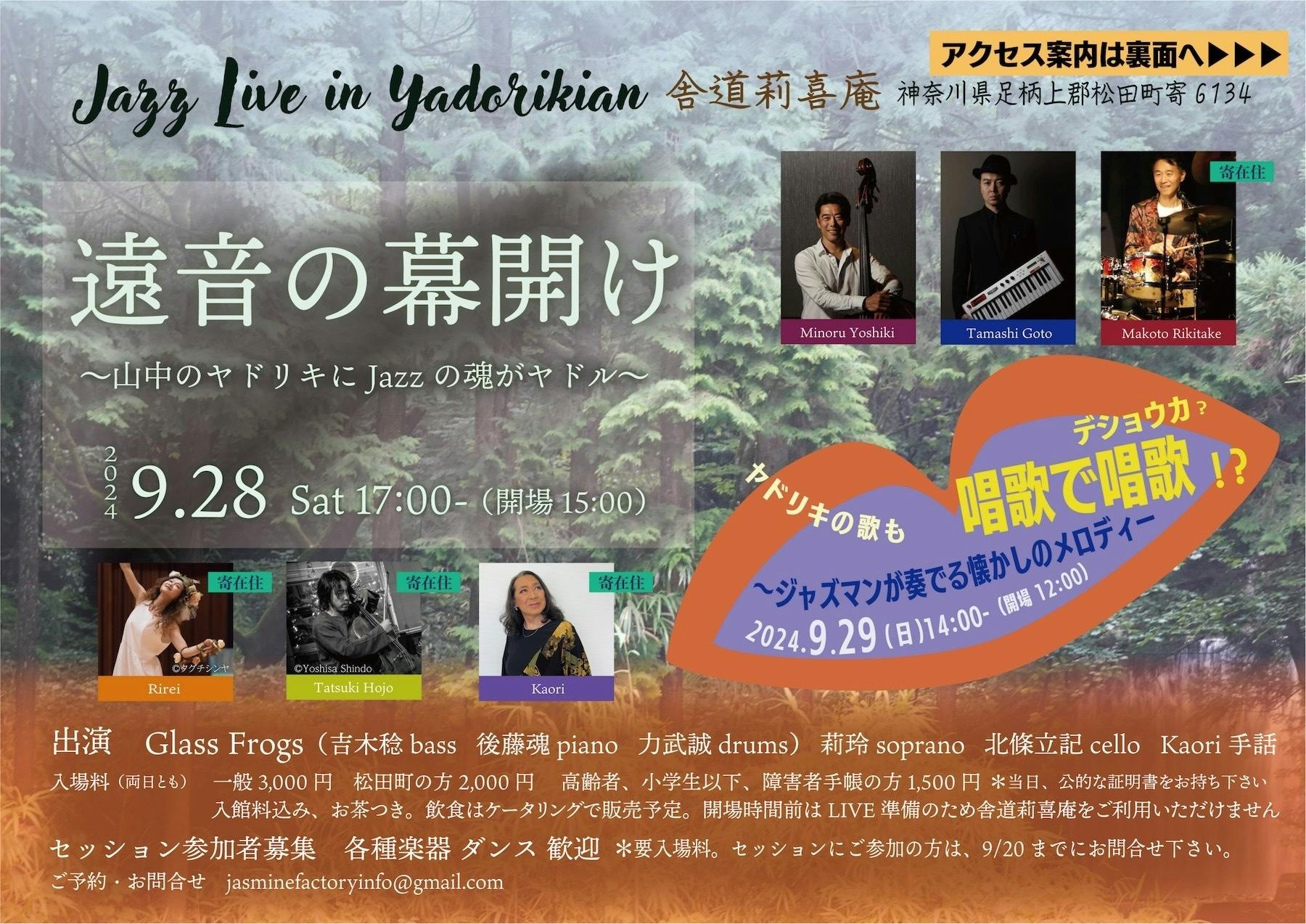 2024/09/03 22:00【舎道莉喜庵で2つのJazzライブを開催!9.28-29】【セッション参加も募集】足柄の山奥にオープンした「舎道莉喜庵」。遠くから聴こえてくる豊かな音の源は、山中にあった。その初の本格ライブとして行う「遠音の幕開け」。唱歌のジャズアレンジをふんだんに楽しめる「唱歌で唱歌(でしょうか)!?」。2日間にわたり、これら2つのライブを開催いたします。2024.9.28(土) 17:00-「遠音の幕開け〜山中のヤドリキにJazz の魂がヤドル〜」2024.9.29 (日) 14:00-「唱歌で唱歌(でしょうか)!? 〜ジャズマンが奏でる懐かしのメロディー〜」《場所・アクセス》舎道莉喜庵足柄上郡松田町寄6134アクセス詳細は末尾に載せています《出演》Glass Frogs(吉木稔 ベース、後藤魂 ピアノ、力武誠ドラム)莉玲 ソプラノ北條立記 チェロKaori 手話《入場料(両日とも)》一般 3,000円松田町の方 2,000円高齢者・小学生以下・障害者手帳をお持ちの方 1,500円 (当日、公的な証明書をお持ち下さい)*入館料込み、お茶つき。*飲食はケータリングで販売予定。*開場時間前はLIVE 準備のため舎道新喜庵をご利用いただけません。〈写真〉タグチシンヤ、新藤義久《セッション参加者大募集》各種楽器、ダンス、パフォーマンス歓迎。 *要入場料。セッションに参加ご希望の方は9/20までに下記へお問合せ下さいjasminefactoryinfo@gmail.com(ジャスミンファクトリー)《アクセス詳細》小田急小田原線「新松田駅」までお越しのうえ下記①か②のバスをご利用ください① 路線バス(東急モビリティ)新松田駅北口バス乗り場にて、「松51 寄(やどりき)行き」乗車、「田代向」下車田代向から舎道喜庵までは車でご送迎いたします9/28(土)・9/29(日)新松田駅北口発の便乗車時刻 7:55 9:40 12:10 13:45 15:059/29(日)お帰りの便「田代向」乗車 新松田駅下車乗車時刻 16:50 17:35 18:50② 乗合バス「のーと足柄」 運行時間7:00~20:00 要予約予約方法スマホアプリ「のるーと」で予約または前日までに電話予約※電話受付(0120-303-062):9:00~17:00配車予約ルートは、新松田駅の「新松田駅南口」乗車、「長寿橋」下車(徒歩1分)料金大人300円 小人・障害者 100円*のるーとによるお帰りの便は主催の方でまとめてご予約いたしますなお、駐車場がございますでのお車でもお越しいただけます(要問合せ)クラウドファンディングのリターンのチケットは1日利用チケットの場合、チケット代金から1000円分に利用できます^ ^!さらにイベント利用チケットの場合はチケット代から1500円分に利用できます。1日利用チケットとイベント代金を併用できます金券をお持ちの方は、お持ちの金額に応じて、対応させていただきます^ ^!ご予約・お問合せ(ジャスミンファクトリー)jasminefactoryinfo@gmail.com もっと見る