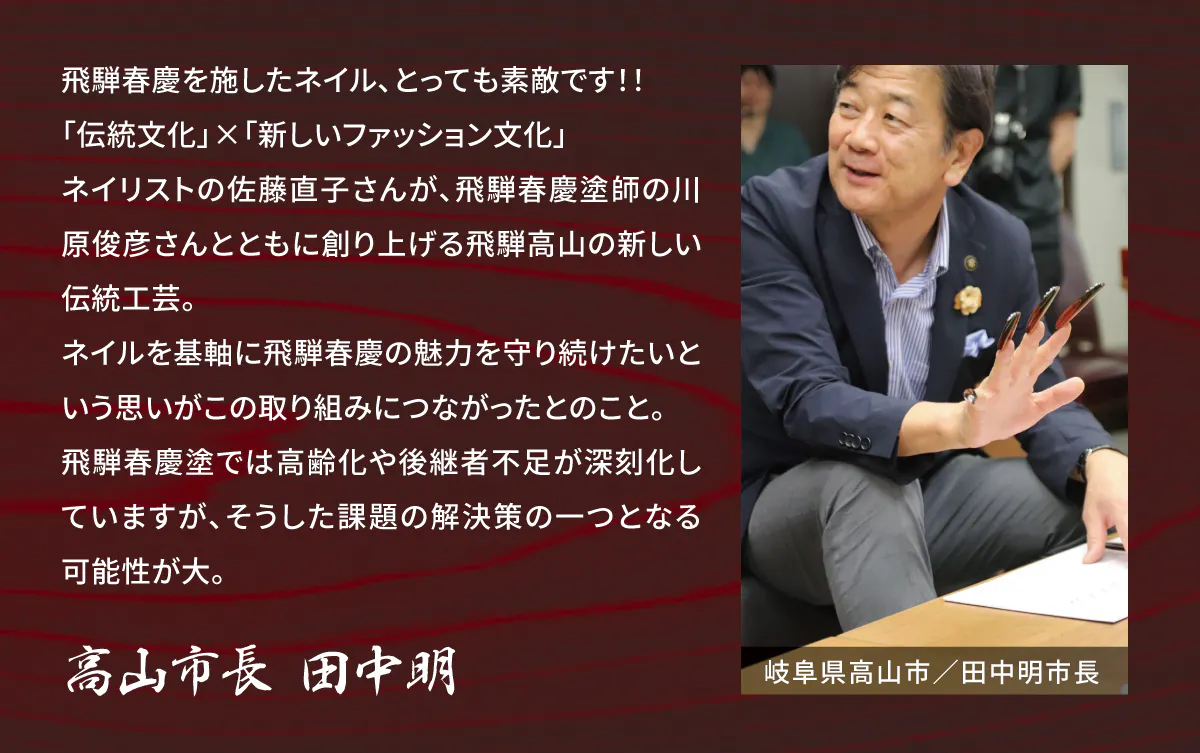 その一歩をネイルという新しいカタチで踏み出し、飛騨春慶の価値を世界まで届けようとしています。