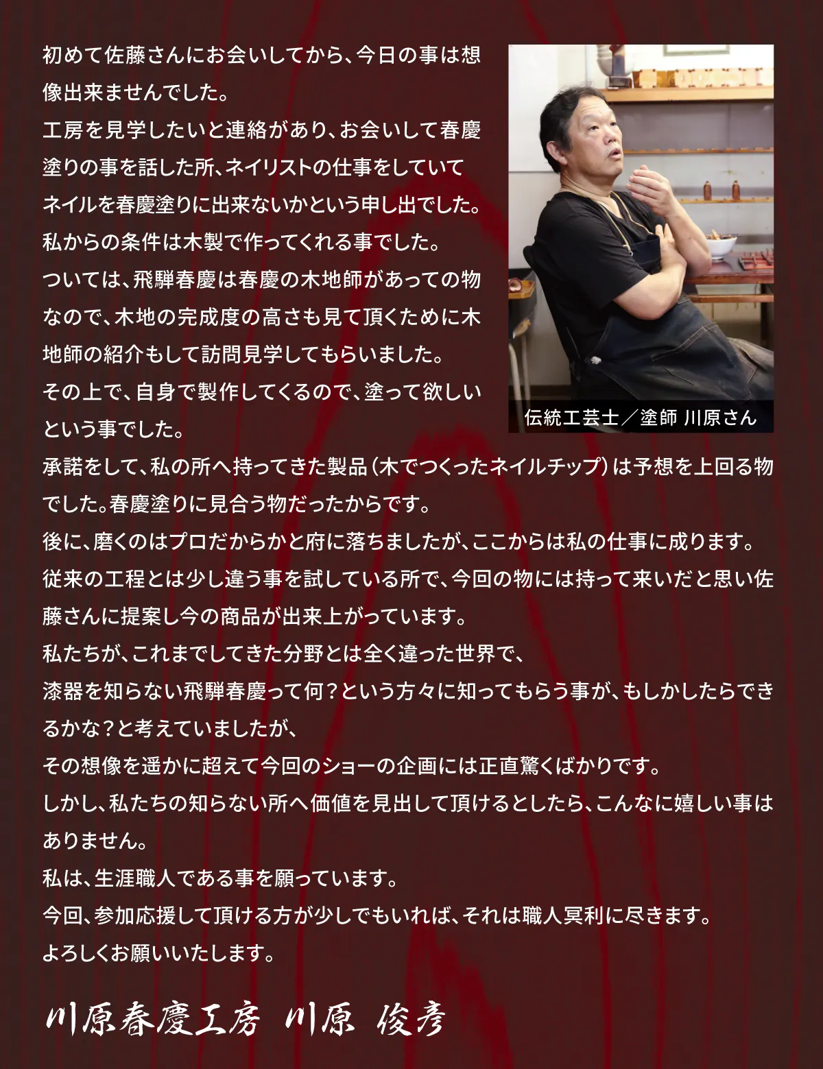 ▼飛騨春慶 塗師 伝統工芸士 川原さんよりメッセージ