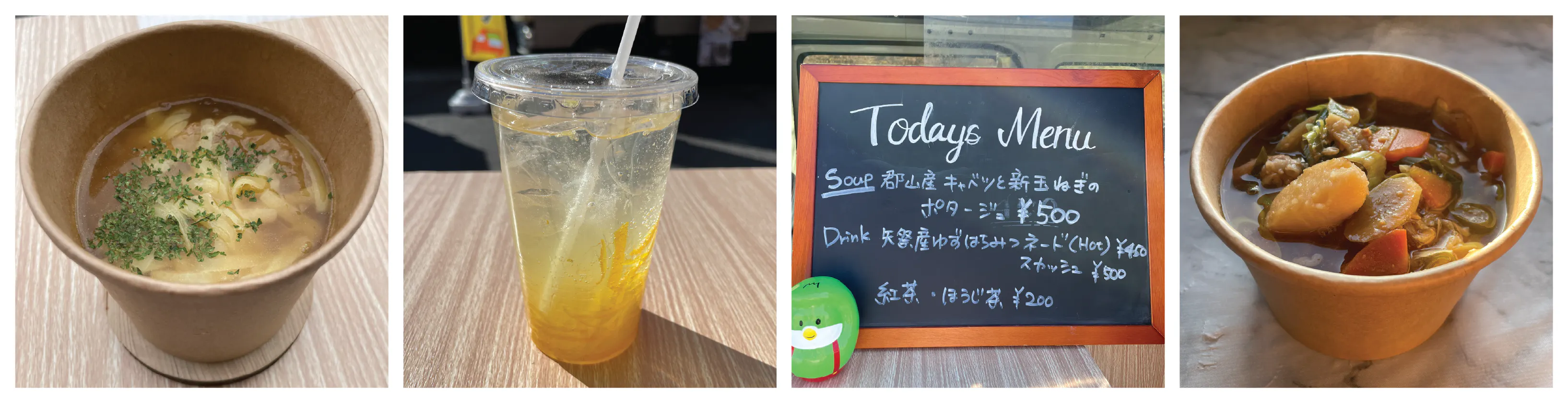 お出ししているのは手作りのスープとドリンク。私なりにこだわった、おいしいお料理を提供しています。
