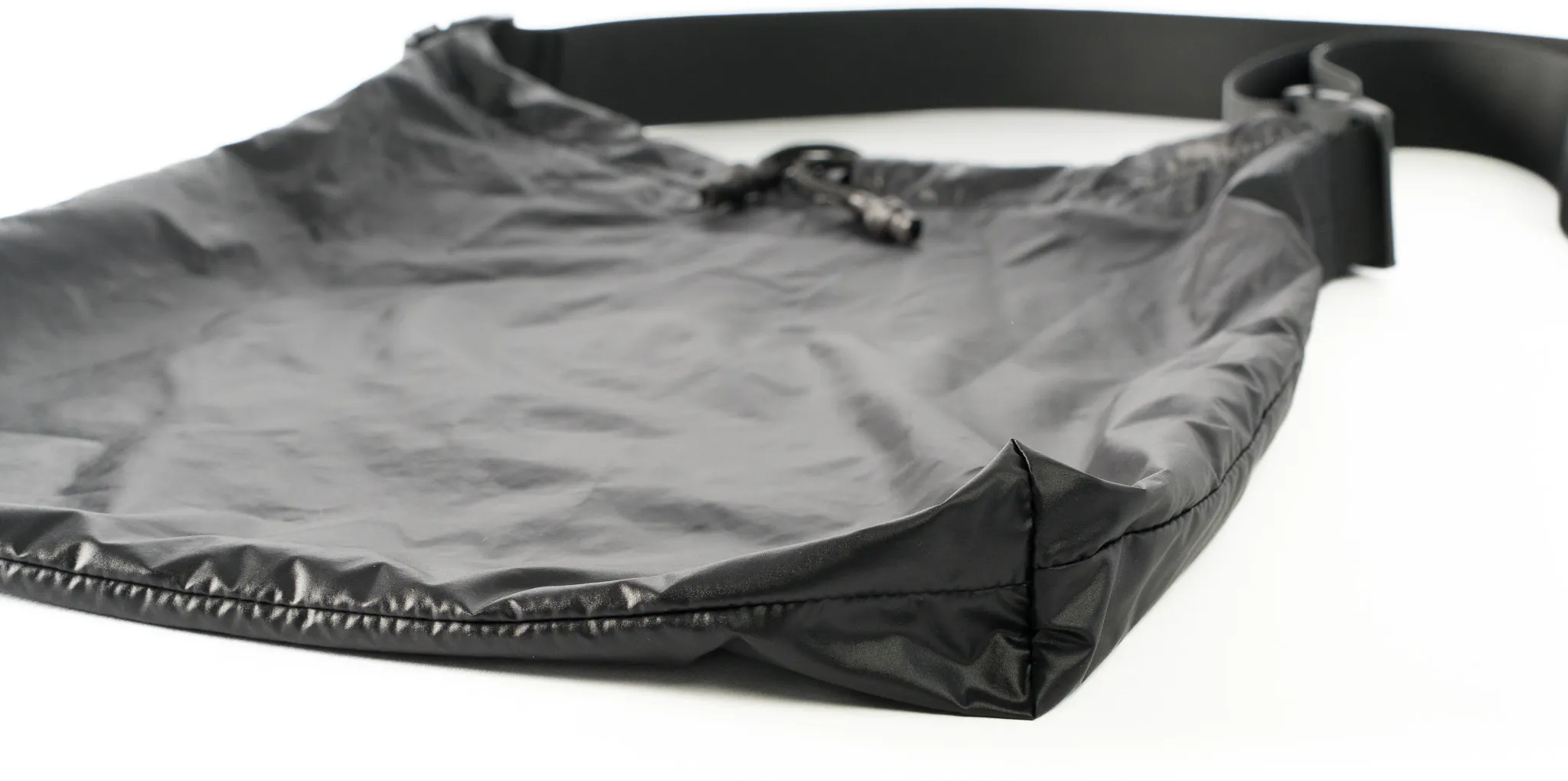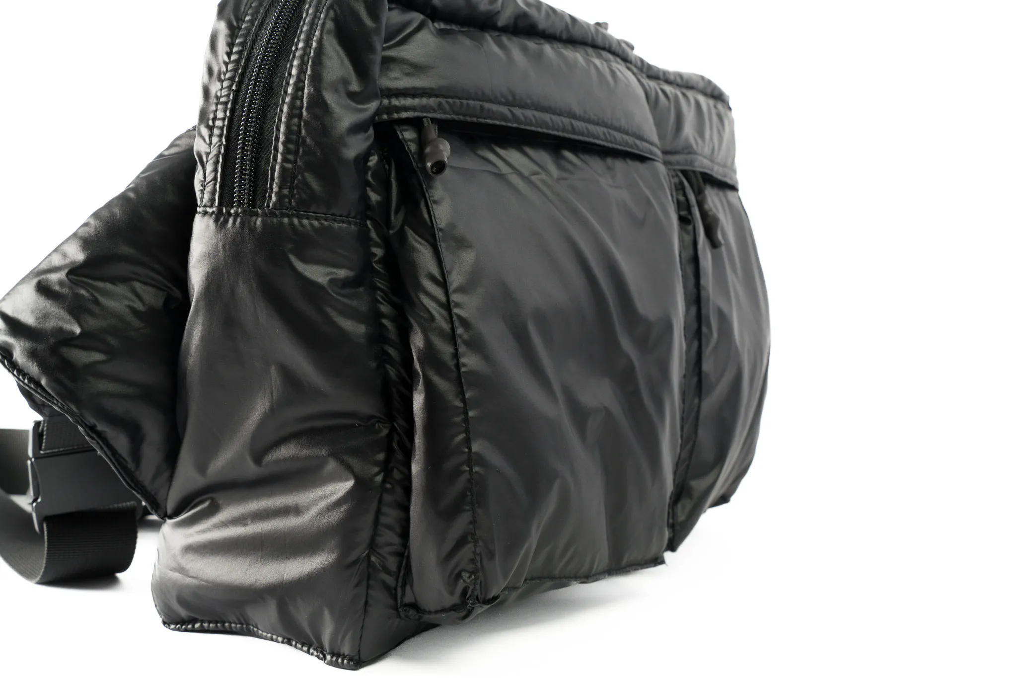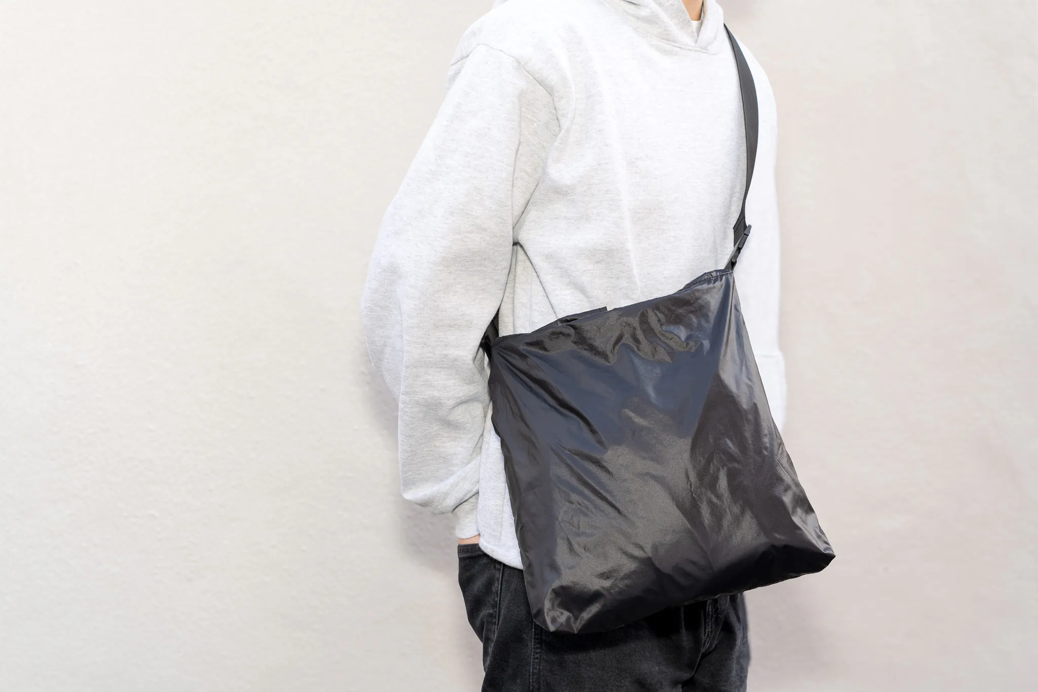 まずわたしたちが追求したのはスリングバッグ本体の軽さ。雨や汚れにも強くてお手入れも簡単。そして強度も兼ね備えた生地を探し求めた結果、行き着いたのは中綿入りのポリエステル素材でした。