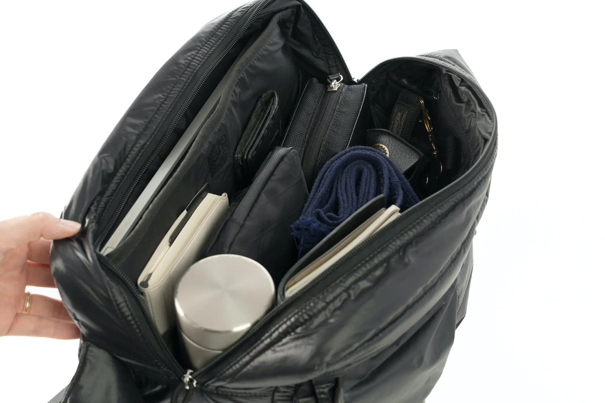 水や汚れに強くて、ミニマルでシンプルなデザイン。それでいてポケット類やPCやガジェット類も入る十分な収納スペースを備えた小回りの利く一品です。