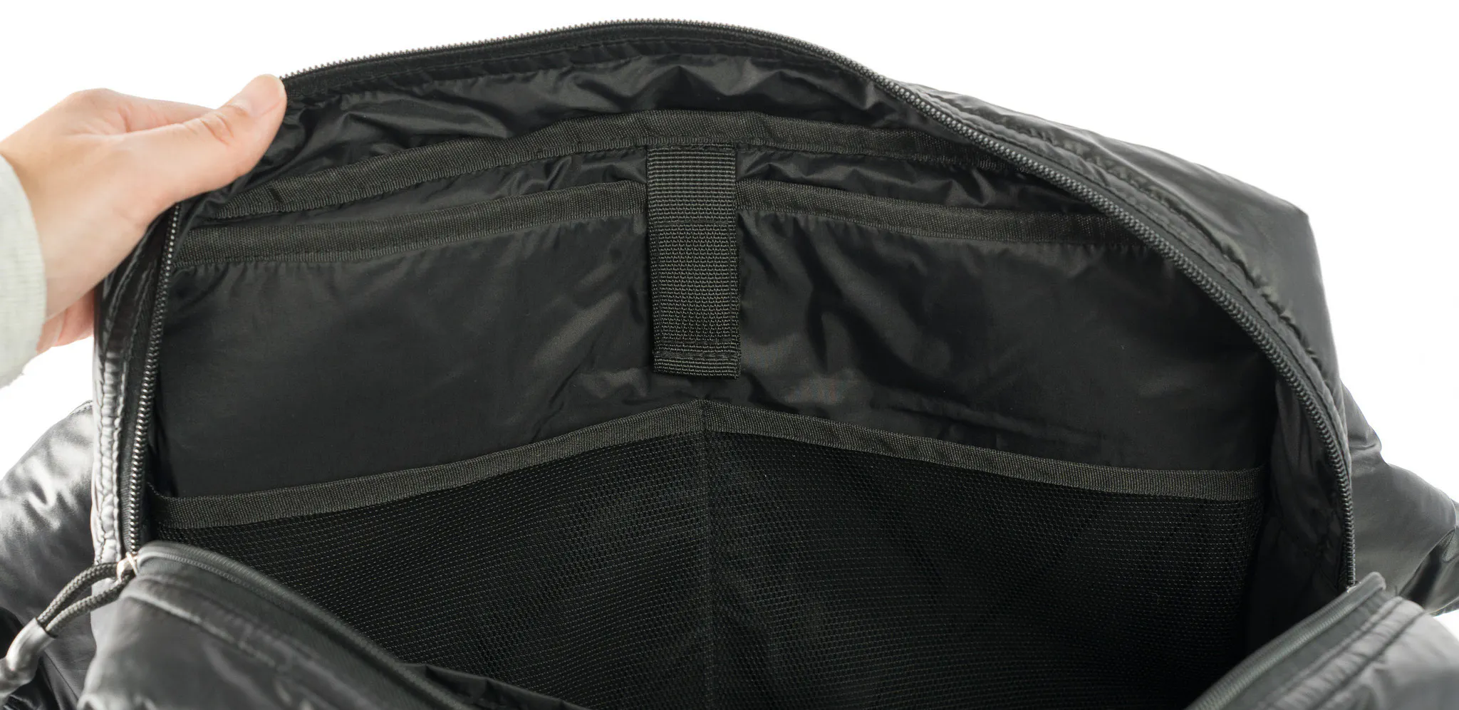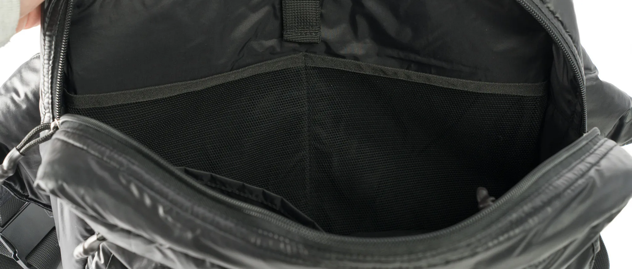 軽さだけでなく、使い勝手と荷物の取り出しやすさにもこだわりました。メインコンパートメントは、ダブルファスナー仕様で、左右どちらにバッグを背負ってもアクセスしやすい設計に。