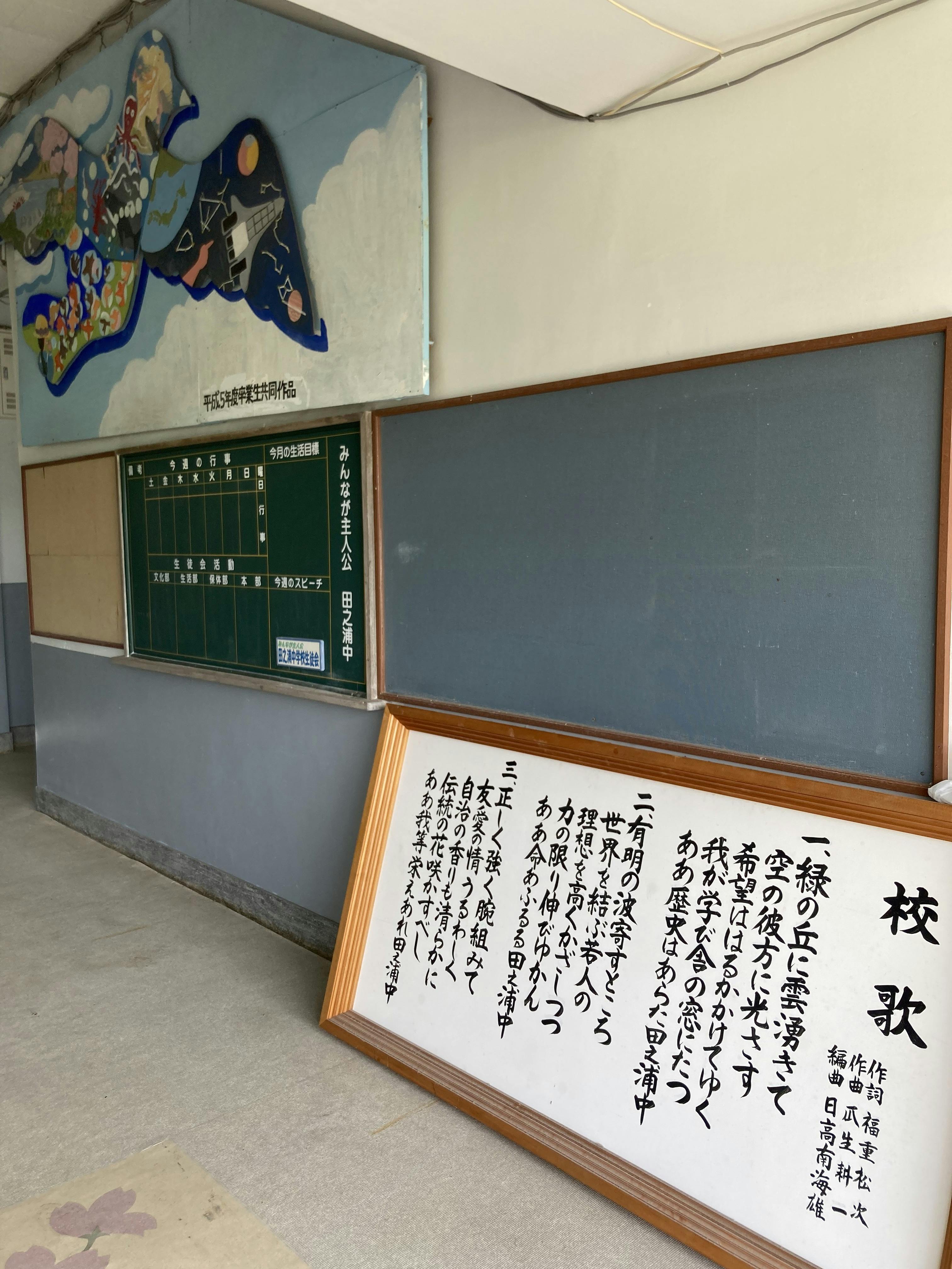 ↑校歌と卒業生作品。校内には当時の息吹を感じるものも多く残っており、それらは極力今後も保存し展示していく方針です。