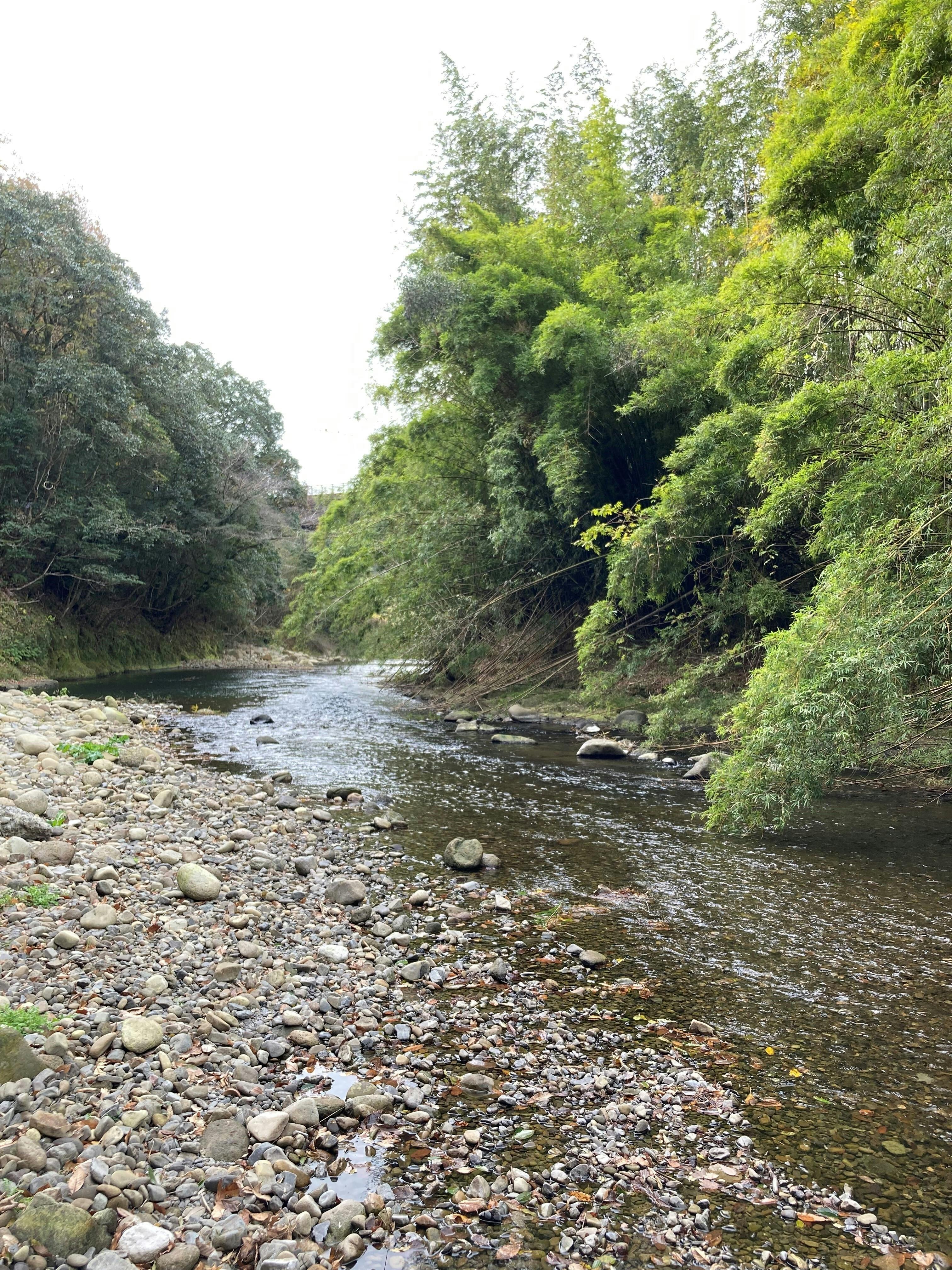 ↑蔵の麓を流れる安楽川。川のせせらぎと木々の音しか聞こえない原風景の中に、田之浦エイジングセラーはあります。