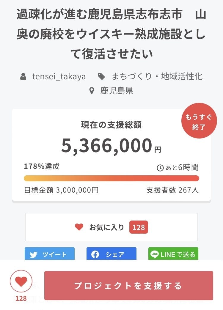 2024/07/28 17:11長いようであっという間のクラファンチャレンジ期間も、本日で終了です。おかげ様で支援額はネクストゴールの500万円を達成いたしました。皆様からの多数のご支援、ご声援決して無駄に致しません。心より感謝申し上げます。チャレンジ期間はいよいよ残り数時間!ご支援迷ってる方おられましたら、最後に是非。田之浦地区を盛り上げられるよう、蒸溜所一度頑張ります!!! もっと見る