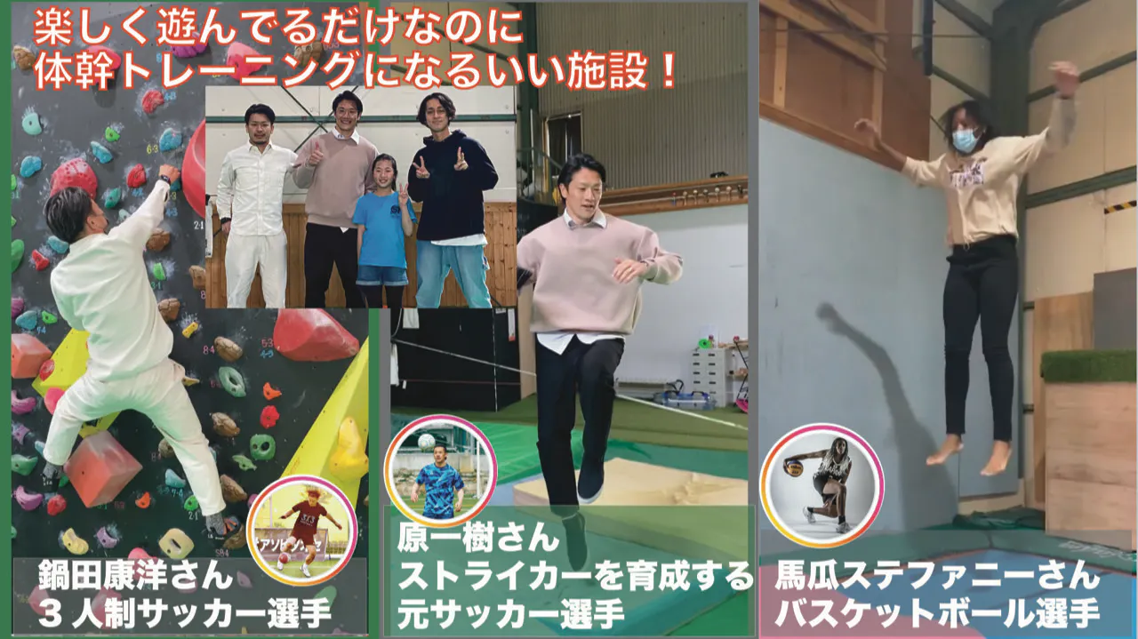 来店いただいたアスリートの皆さま、スラックラインもトランポリンもボルダリングも体幹を身につけるにはいいスポーツだし、何より楽しく遊んでいるだけでいろんなスポーツに必要な体幹やバランスが身に付く!いい施設と好評いただいています!