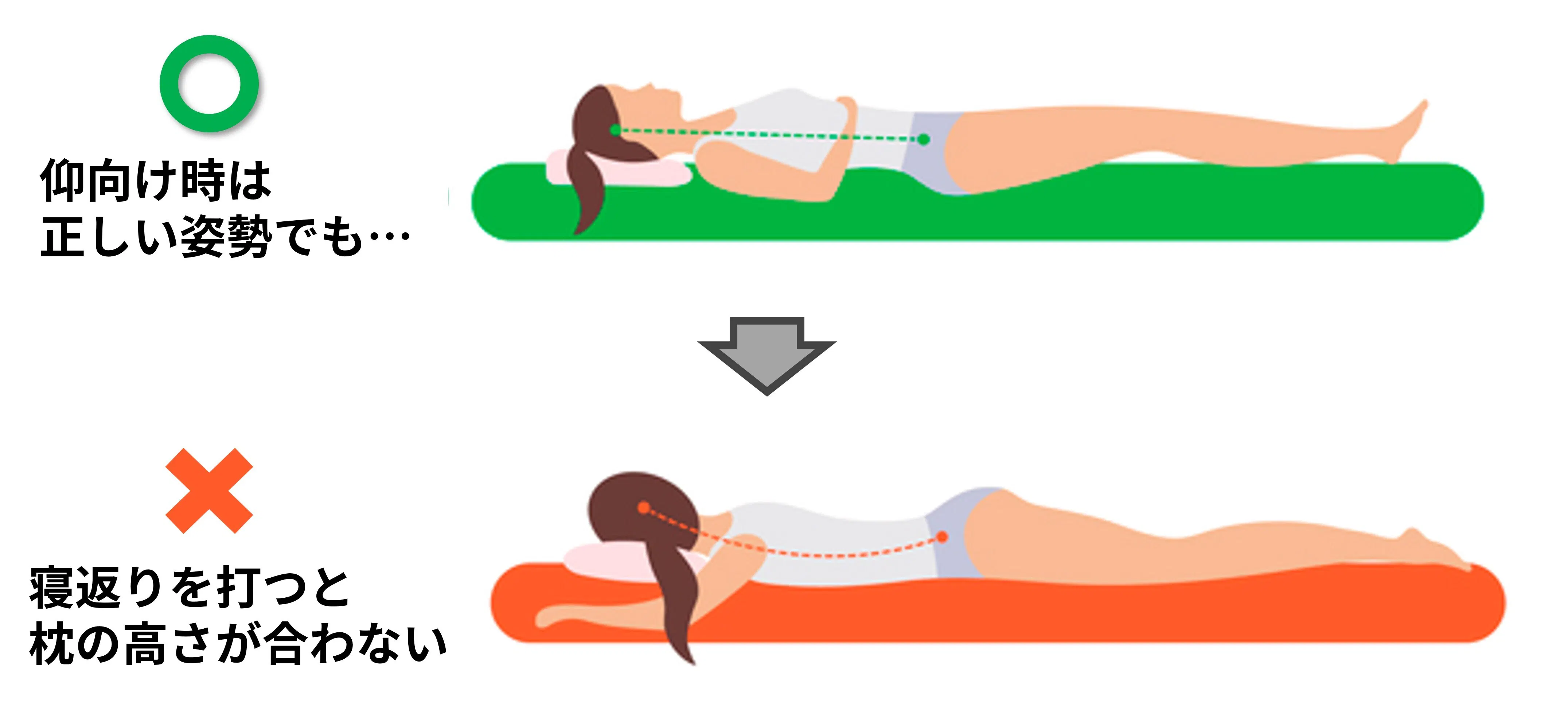 人は睡眠中の体圧分散や背中の体温調整のため一晩で平均20回も寝返りをしますが、実はそのたびに頭の高さが変わり首や肩の筋肉に負担がかかり続けます。