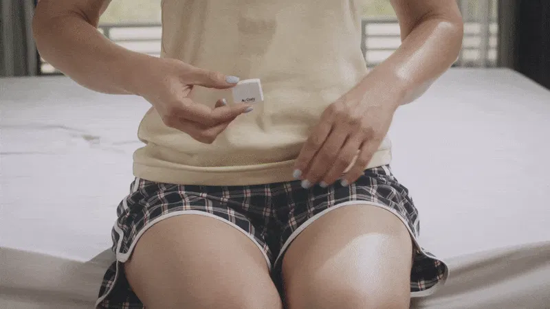 ③ デバイスを充電器から外し、付属のホルダーに入れます。そのホルダーを、パジャマなどのパンツの縁に装着します。