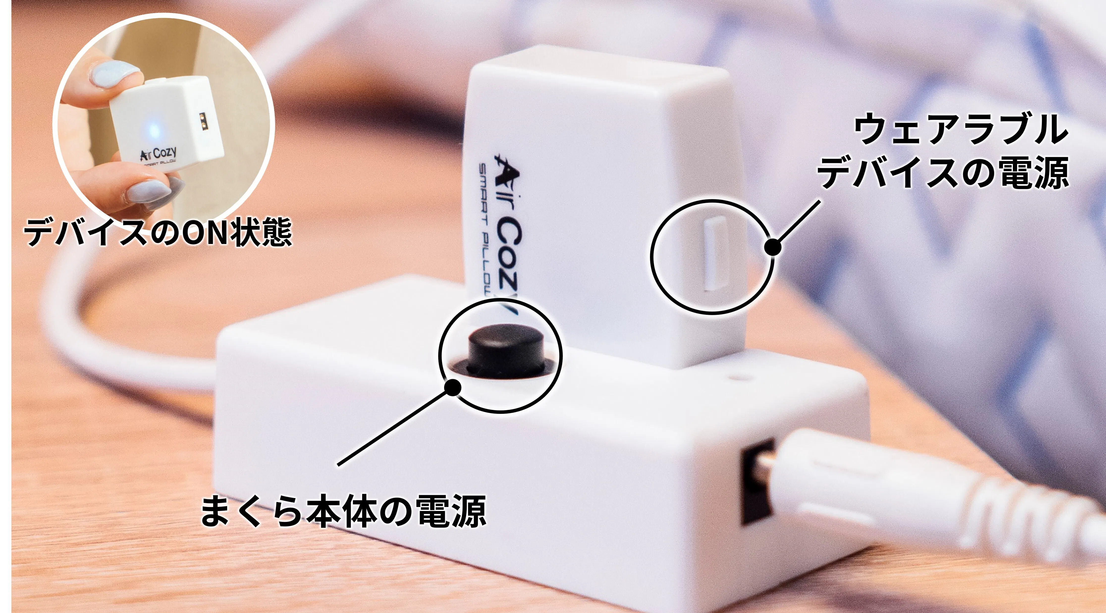 ② まくら本体とウェアラブルデバイスの電源をそれぞれONにします。(デバイスはボタンを長押しするとONになり、青色に点灯します)