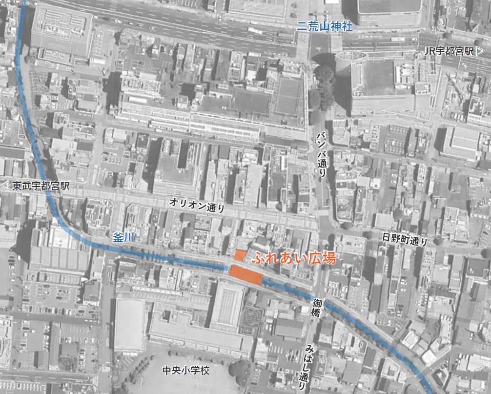 プロジェクトの実施場所は、宇都宮の中でも特に中心部であるオリオン通りに面する釜川沿いです。ここには、市民の憩いの場としてふれあい広場が整備されましたが、今はあまり活用されていません。ここと隣接のポケットパークに、ブックカフェやベンチを設えることで、宇都宮のまちなかに賑わいを取り戻します。これをきっかけに、ふれあい広場周辺の空き家、空きテナント、低未利用地等との一体的な利活用を目指します。