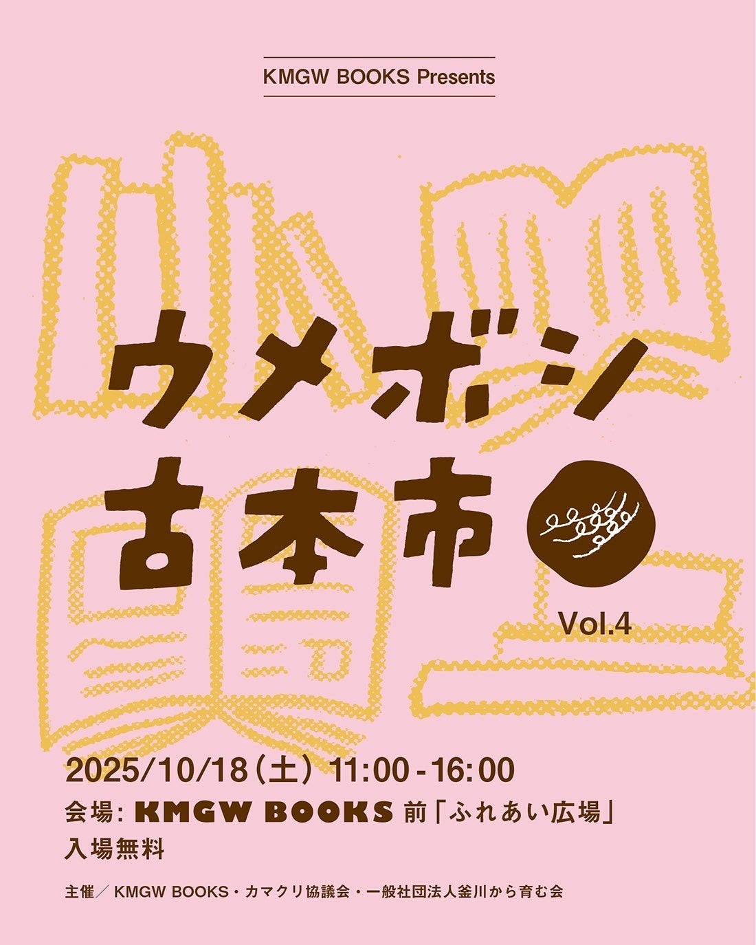 2025/10/04 10:56KMGW BOOKS前のふれあい広場で、10月18日(土)11時〜16時 に【第4回ウメボシ古本市】を開催します!「本を通じて人と人が交流できる場」を目指して、小さな本屋さんが集まる一日をつくります。また、ウメボシ古本市へのご出店者も募集しております。複数人での合同出店や、一箱からの出店も大歓迎です!お申込みフォームは下記に記載いたしましたので、ぜひご検討ください。今はまだ小さな取り組みではありますが、将来的には栃木を代表する古本市のひとつに育てていきたいと考えています。皆さまのご出店、ご来場を心よりお待ちしております!▽募集詳細・お申込みはこちらhttps://forms.gle/Q8KyVEVgdeSRfkok6【開催概要】日時:2025年10月18日(土)11:00~16:00会場:KMGW BOOKS前「ふれあい広場」宇都宮市曲師町5https://maps.app.goo.gl/acSt3vxhuWWE3Hb78※お車でお越しの際は、周辺のコインパーキングをご利用ください出店スペース・料金:・スペース①(1m×2m、テント持参あり):1,000円・スペース②(1m×2m、テント持参なし):1,500円・スペース③(2m×2m):2,000円※複数人で1スペースをシェアしての合同出店も可能です入場:無料主催:KMGW BOOKS・カマクリ協議会・一般社団法人釜川から育む会 もっと見る