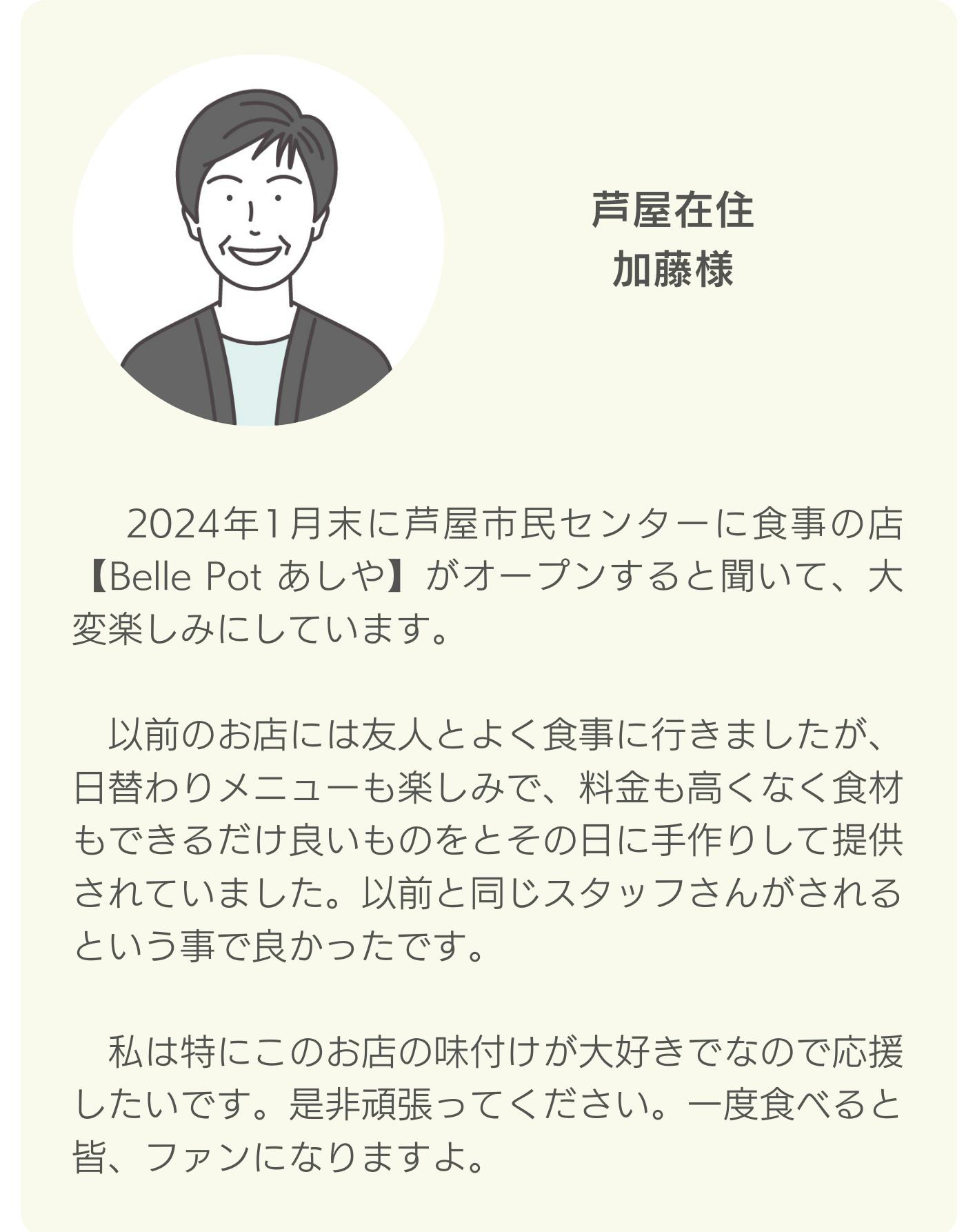こうして2024年1月28日より、高齢者が生きがいを持って働ける場所として、芦屋市民センター2階に【一般社団法人ブランディング芦屋】が運営する飲食店【Belle Potあしや】を開店する運びとなりました。おいしい食事と憩いのひとときを市民の皆様に提供できることを、とても嬉しく思っています。