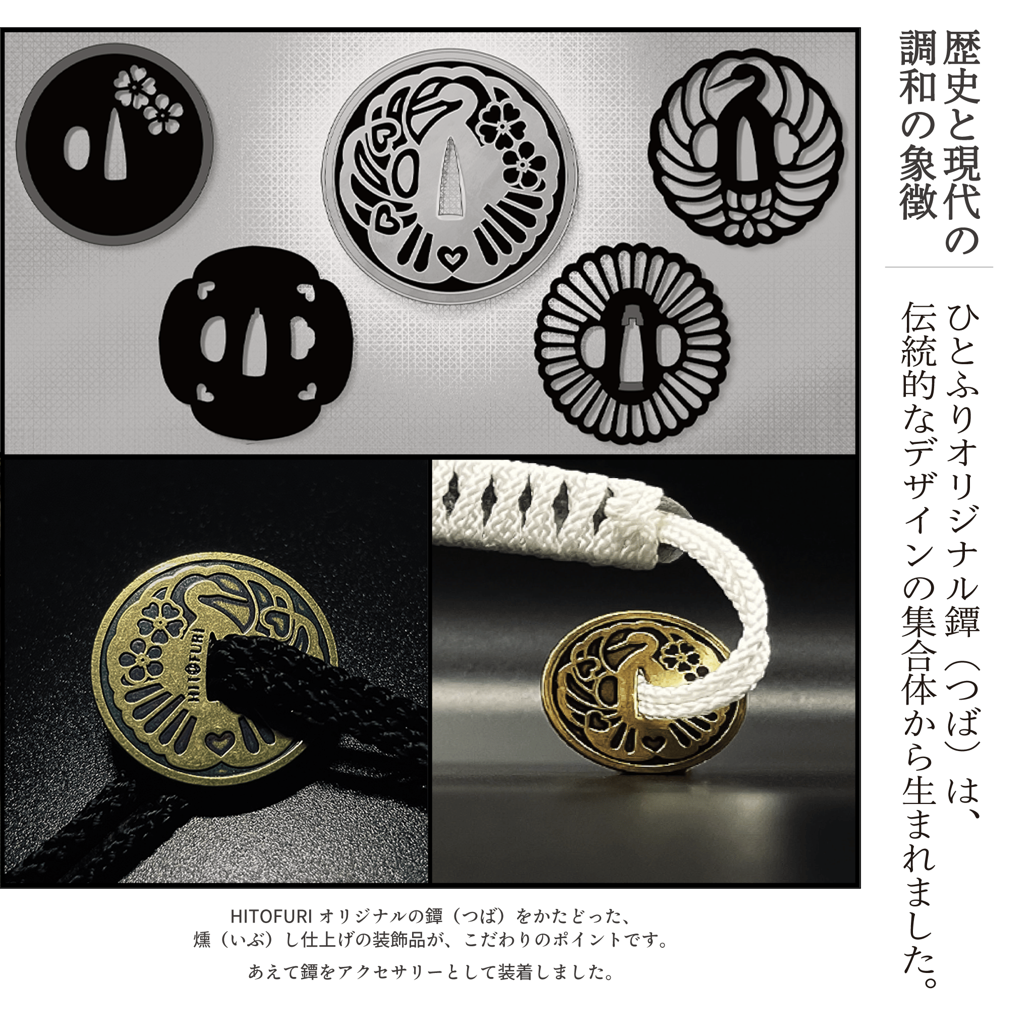 HITOFURIオリジナルの鐔(つば)をかたどった、真鍮いぶし仕上げの装飾品も、こだわりのポイントです。