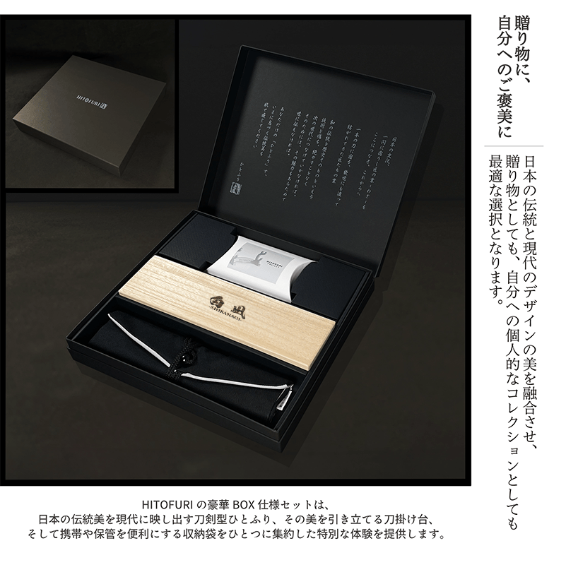 刀掛け台と収納袋のセットは、すべてHITOFURIオリジナルの豪華BOX仕様です!