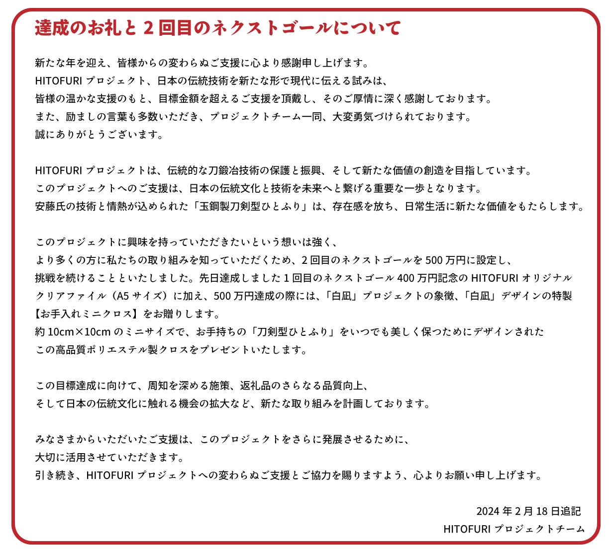 2025/03/04 20:29いつもHITOFURIプロジェクトを応援いただき、誠にありがとうございます。この度、3月6日(木)朝8時よりスタートする春の新プロジェクト【桜の西陣織&白蛇2025カード版】が公開となります!▼プロジェクトURLhttps://camp-fire.jp/projects/825856/preview?token=3re2tn84&utm_campaign=cp_po_share_c_msg_projects_show◇ 今回の見どころ ◇・西陣織は桜だけじゃない、新作「さやがた文様ブラック」の御守型ひとふり・2025年干支“白蛇”をあしらったカード版お守り刀・玉鋼×西陣織の雅が融合し、数量限定でご用意さらに、【3/6~3/9限定5%OFFシークレットクーポン】を発行予定!シークレットクーポン受け取りや“お気に入り登録”の手順は公式LINEでご案内中です。▼公式LINE登録URLhttps://lin.ee/PMeAiHWまた、3月8(土)・9(日)は東京・新橋のおかやまアンテナショップにて実物を手に取れるポップアップストアを開催。刀鍛冶 安藤広康も来場し、直接お話しいただけます。みなさまぜひお越しください!こちらも詳細は公式LINEにて!新しいHITOFURIの挑戦、ぜひご覧ください!引き続き、何卒よろしくお願いいたします。HITOFURIプロジェクト一同 もっと見る