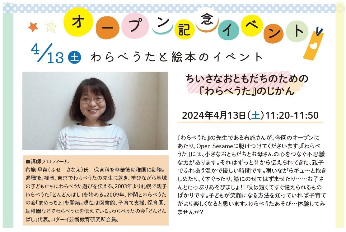 オープニング企画NO2 布施早苗先生によるワークショップ『ちいさなおともだちのめたのわらべうたのじかん』のご案内♬