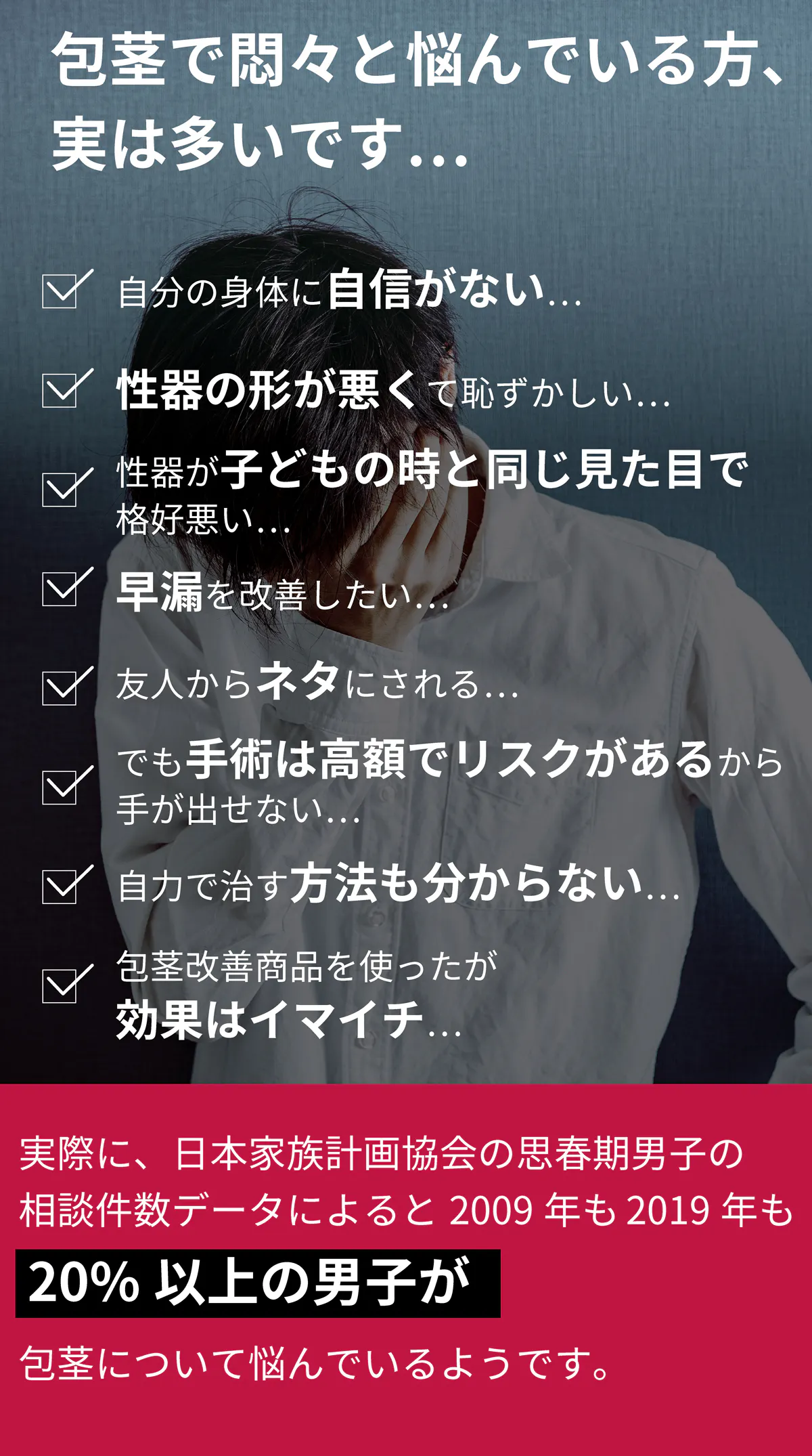 仮性包茎に関しては、18歳前後から悩んでおり、市販のほぼ一通りの包茎改善商品を20年以上使ってきました。