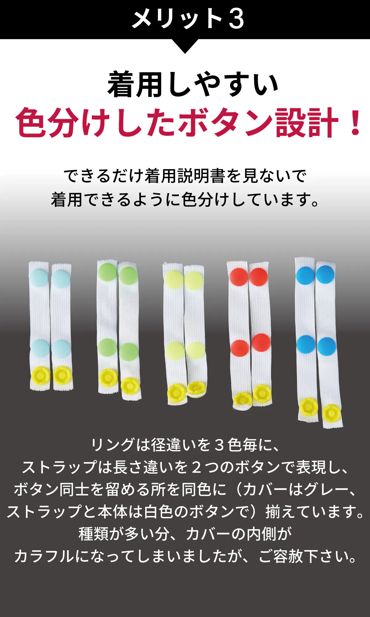 リングは脱落しても紛失しないよう設計し、洗濯機で洗える仕様のため管理もしやすいです。