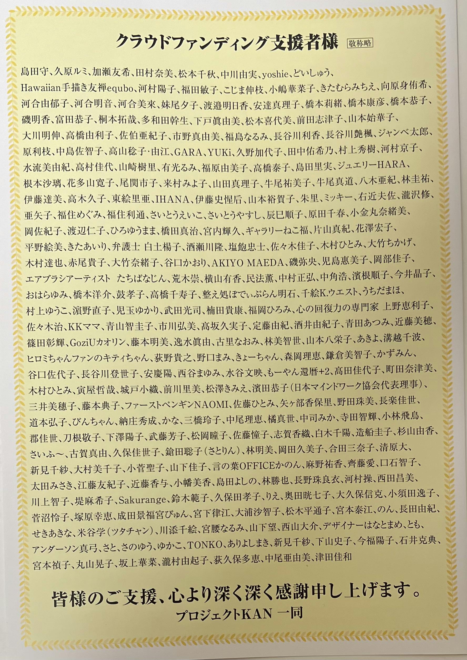 2024/05/09 20:28改めまして、この度は「プロジェクトKAN」のクラウドファンディングへの温かいご支援をありがとうございました。全てのリターンを完了させることができましたのでご報告させていただきます。もしまだ届いていないなど不手際がございましたら、お手数をおかけしますがご連絡をいただ来ますようよろしくお願い致します。こちらのリターンでは、体験していただくものもありいろんなドラマもあったようです。舞台本番でのお客さまのドラマなど、いろんな裏側も座長國本ヒロミのブログに超大作として掲載されておりますので、ぜひ合わせてご覧くださいませ。なんか知らんけどうまくいく①【お芝居のプロデュース公演やっちゃいました!!】https://ameblo.jp/aisunonn/entry-12850007270.htmlなんか知らんけどうまくいく②【途切れないご縁で成り立ったプロジェクト】https://ameblo.jp/aisunonn/entry-12850070081.htmlなんか知らんけどうまくいく③【挑戦とは、決めること】https://ameblo.jp/aisunonn/entry-12850274867.htmlなんか知らんけどうまくいく④【枠を外して、大規模アップデートした人たち】https://ameblo.jp/aisunonn/entry-12850661426.htmlなんか知らんけどうまくいく⑤【動画配信★決定!】https://ameblo.jp/aisunonn/entry-12850736145.htmlなんか知らんけどうまくいく⑥【シンクロ!】https://ameblo.jp/aisunonn/entry-12851369088.htmlそして、なんとなんと↑こちらにもありますように動画配信が決定しましたっ!!本番を見逃してしまった方、もう一度あの興奮を!!というあなた!!ぜひぜひ動画でもご覧になってください。詳細は、ブログに記してありますので、ご覧くださいね。この度は本当に本当にありがとうございました。プロジェクトKAN 制作部一同 もっと見る