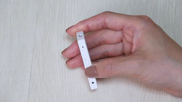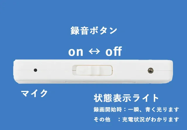 "ぽけレコ"なら、長方形で持ちやすく、片手でスマートに録音開始。ボタンに印字された▶️マークの向きに沿ってカチッとスライドさせれば録音開始です。録音を開始すると、青いランプが一瞬点灯します。