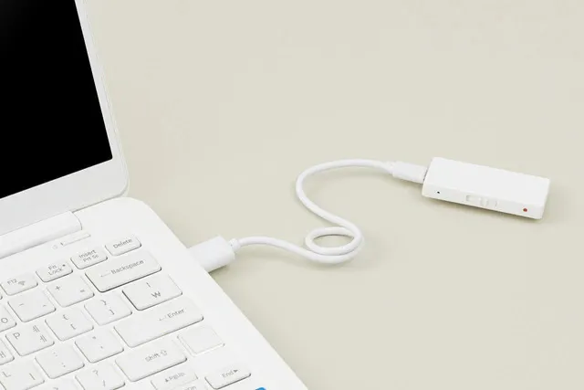 付属のケーブルで、パソコンに繋いでください。ファイル一覧に表示されたmp4ファイルを再生します。必要に応じて、データを取り込んでください。不要なデータはパソコン上で削除することで、ボイスレコーダーの容量が確保できます。
