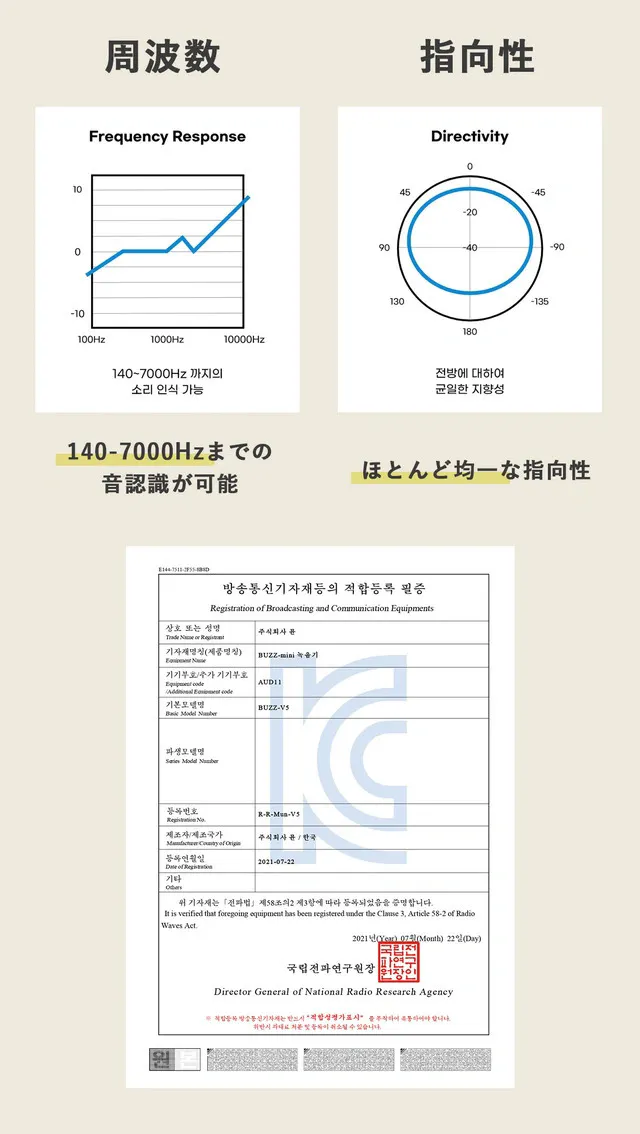 韓国科学技術委の騒音および振動制御センターで、本商品の録音品質テストを行いました。140~7000HZの周波数まで音認識が可能で、指向性もほとんど均一であることの確認が取れました。