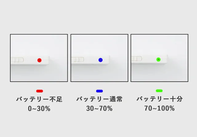 ランプの色で、充電の残量がわかります。充電が減ってきたら、USBケーブルで充電してください。