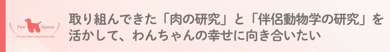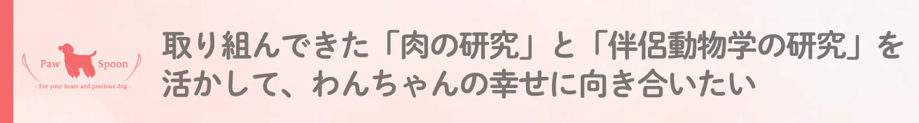 肉と伴侶動物学の研究をしてきた私は、科学的に栄養素が充実しており、さらに愛犬もオーナーも幸せを感じることができるフードを開発することが、私の使命だと強く感じました。