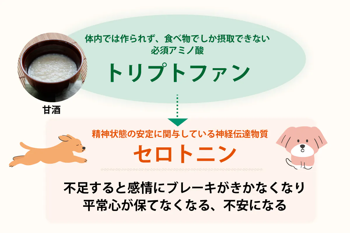 鹿肉と甘酒に多く含まれる『トリプトファン』は、脳内ホルモンであるセロトニンの合成に必要な栄養素です。セロトニンは、リラックスや睡眠、食欲のコントロールなどに関わっています。そのため、犬の精神安定や睡眠の質の向上、食欲のコントロールなどの効果が期待できます。