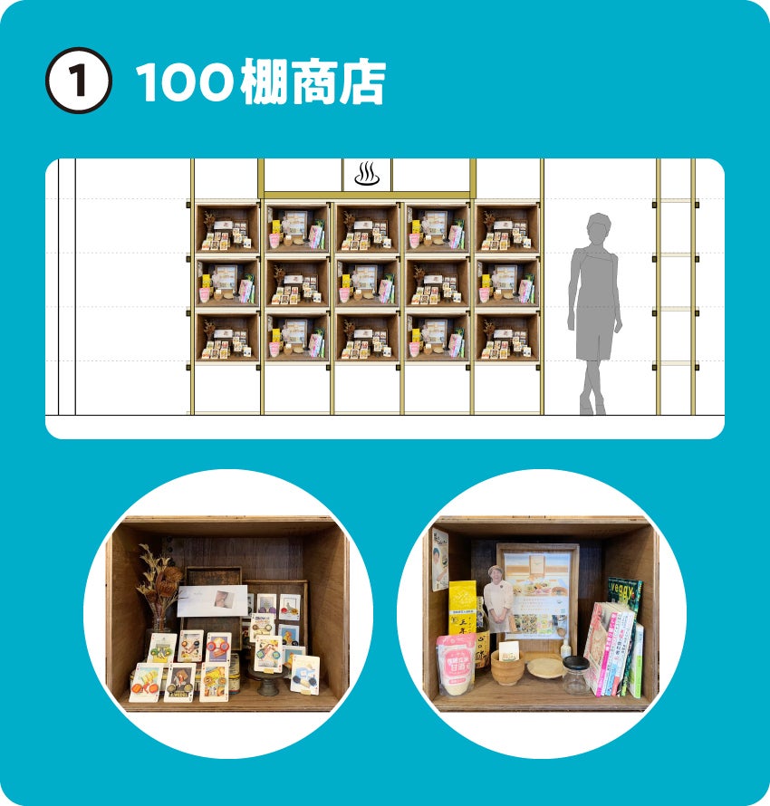 100個の「貸し棚」が並び、シェア屋台・ポップアップストア・キッチン・レンタルスペース・学びの場が複合的に同居することで【 100人商店会 】というコミュニティを生み出していきます!