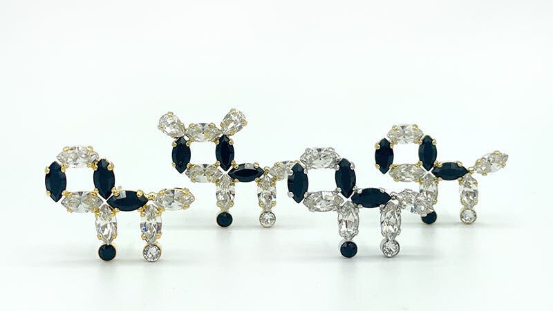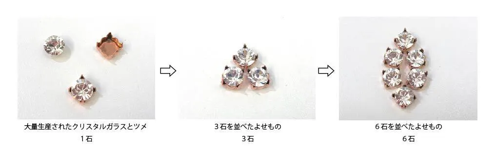 つまり、同じ形、同じサイズがあるなら、事前にそのクリスタルガラスを留める土台(ツメ)を作っておけば良いという考え方になりました。すでに、金属をプレス加工する技術はあったのでツメも大量生産できました。しかし、それでは、石が1つに対して、ツメが1つ。デザインの面白さがないため、それらをさまざまな形に並べてデザインする必要が出てきました。