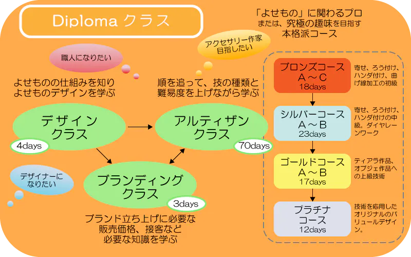 カリキュラムは、文化服装学院ファッション工芸専門課程ジュエリーデザイン科で非常勤講師として指導を続ける高橋が培った内容をさらに進化させた、初心者から順を追って成長が見込める指導内容になっています。