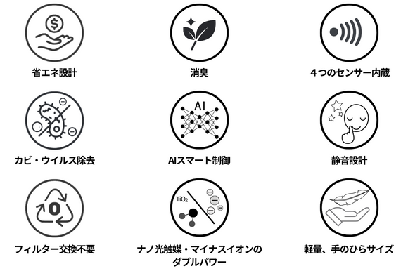 【AIRone】は、宇宙ステーションなどで注目・活用されている先進の光触媒技術を採用。コンパクトながらも高性能な清浄能力を持ち、AIが24時間365日、あなたの家の空気を守ります。