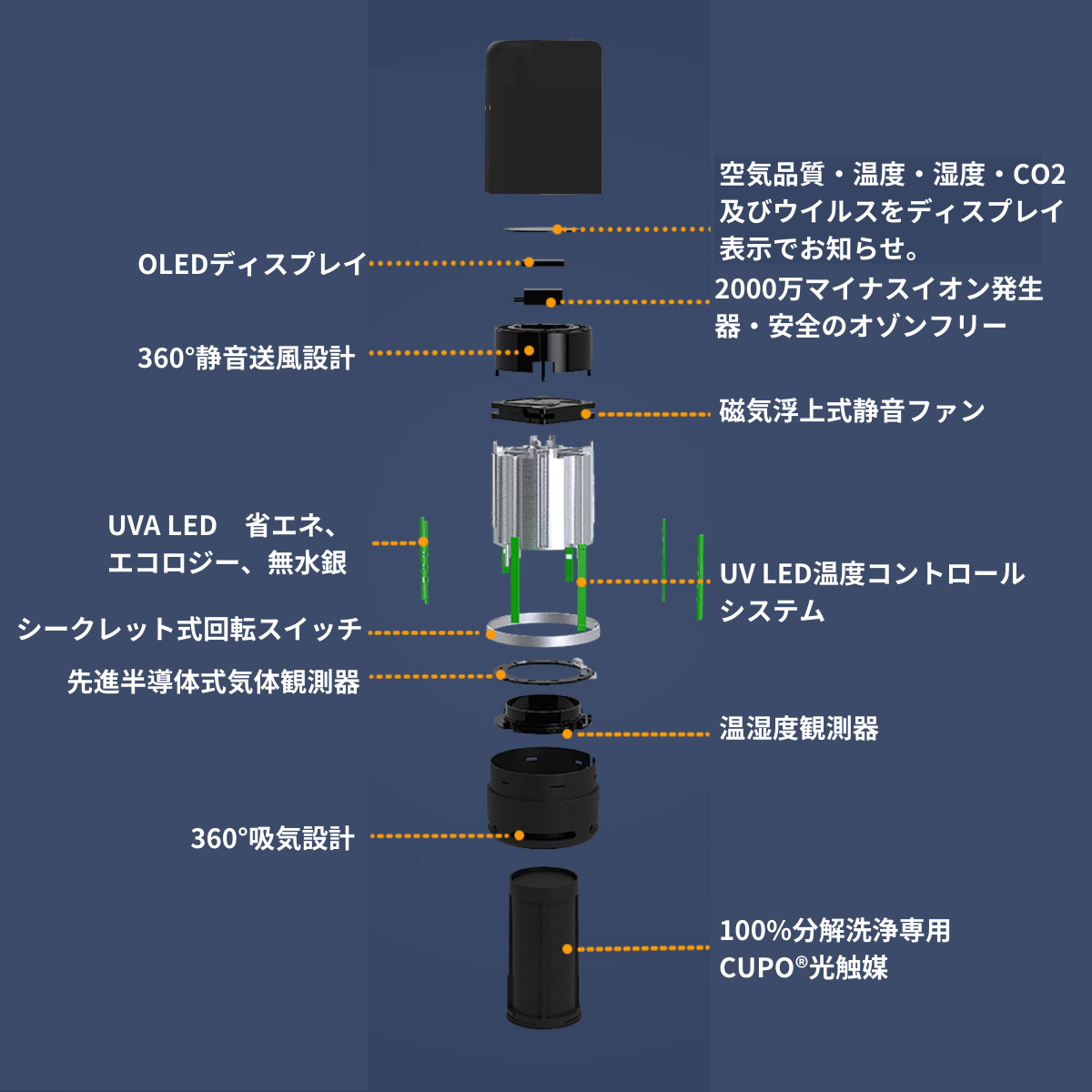 1.最新の半導体式気体感知センサーを内蔵して、空気の質やCO2濃度を即時に測定。適切なファンの速度やUV LEDの光量を自動で調整し、最適な空気清浄を提供します(スマートコントロール機能)