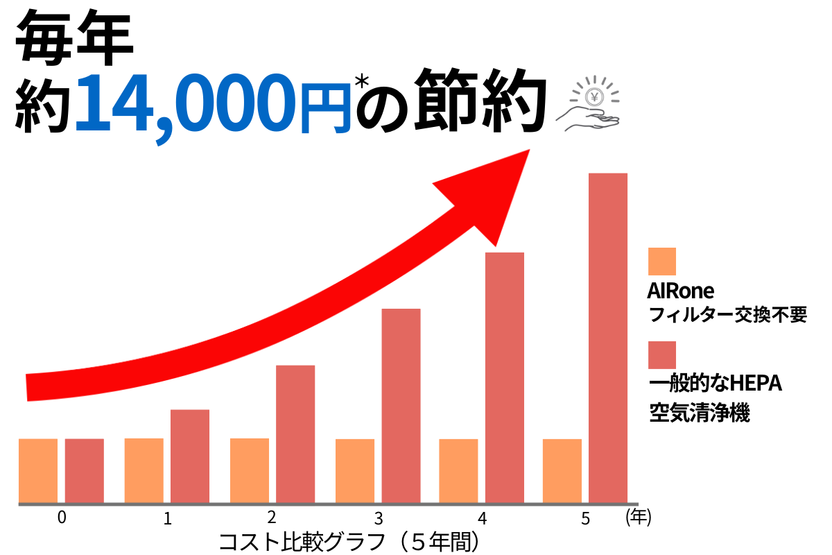 しかし、【AIRone】は最新の自動コントロールシステムを採用。常時、キレイな空気を供給しながら最大消費電力はたったの9Wという省エネ性能を実現しています。結果、1か月の電気料金はなんと最大200円ほど