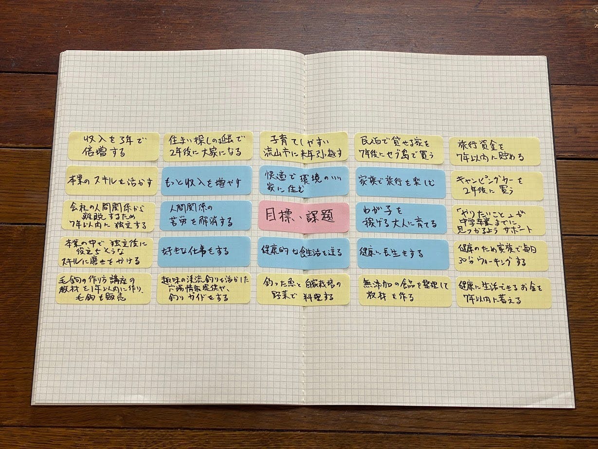 中級編では、ふせんを使って「やりたいこと」を見つけ、子供の人生の設計図を作り上げます。