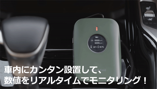 キャンプなどアウトドアを楽しむ場に行くまでの道中もしっかり備えてください!特に帰り道はそれまでの疲れがたまって眠気にも襲われやすい状況…車内に「Cam.G Field」を設置して換気のタイミングを見える化!