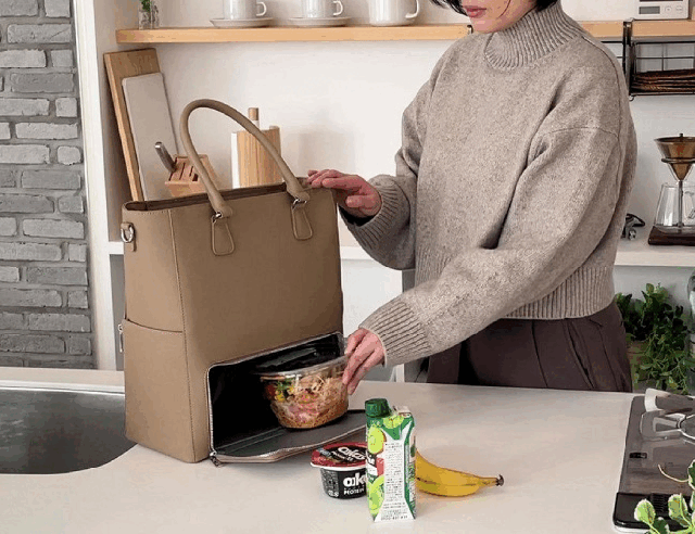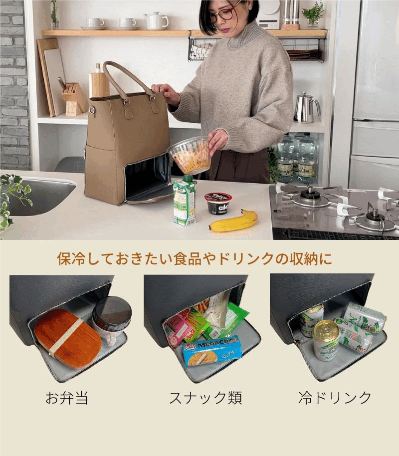 下段の保冷保温スペースは、断熱素材のEPE,PE,PETを使用し、表面は水分を弾き、見た目にも品のあるPVCで2層構成で製作しています。