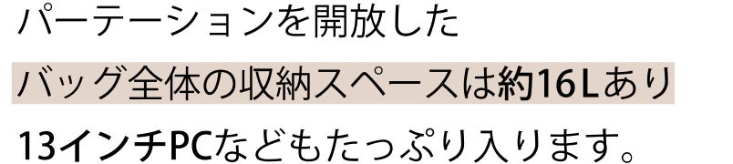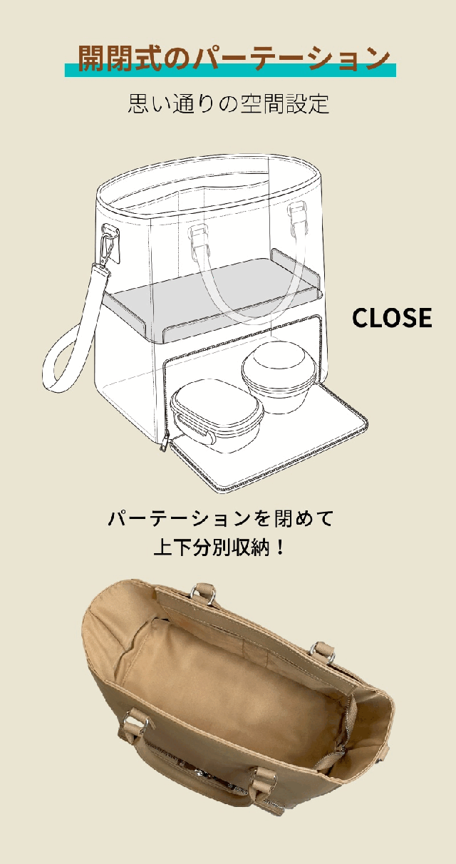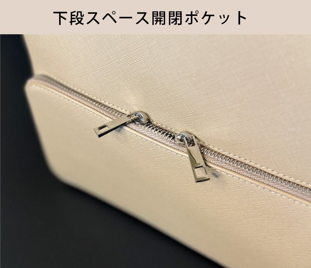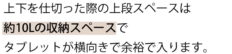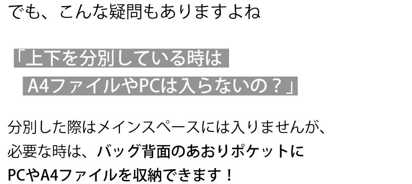 ※バッグの構造上、上下分別して使用する際は、重たいものは、出来る限り下段スペースやあおりポケットをご活用ください