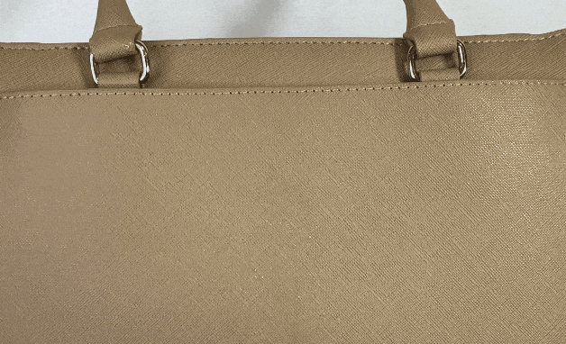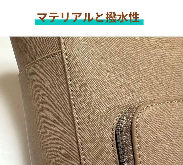 バッグ本体のサフィアーノレザー調の合成皮革は、縦長2重構造の"FLOORTOTE vertical"にとてもよく合う素材です。 合皮がふにゃふにゃせずシルエットをキープしたいデザインバッグに向いた素材です。 細かく上品なシボの型押しは、擦れに強く、高級感もあり、傷が目立たず、撥水性がある素材です。