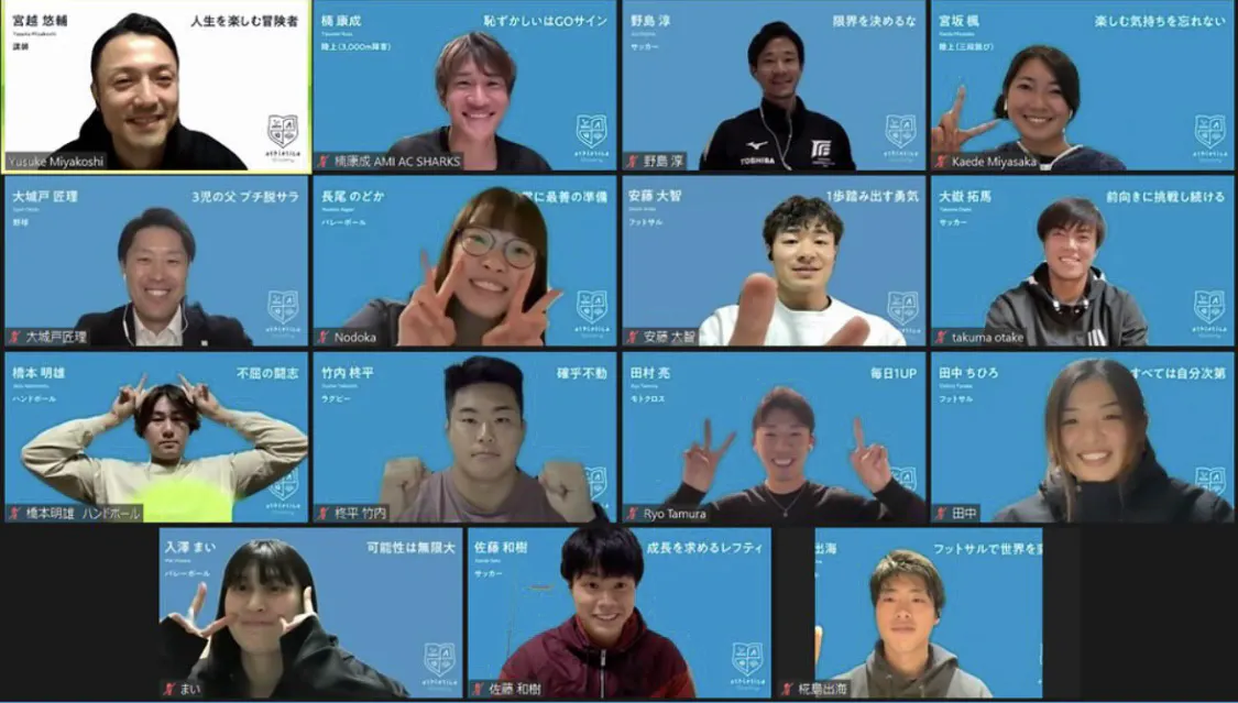 簡単にアスレチカアカデミーを説明すると、アスリートのセカンドキャリアに特化したキャリアコーチングをオンラインで受けることができ、その特徴は何と言っても、審査を通った多種多様な競技アスリート20人が学校のように集まって一緒に学ぶところです!