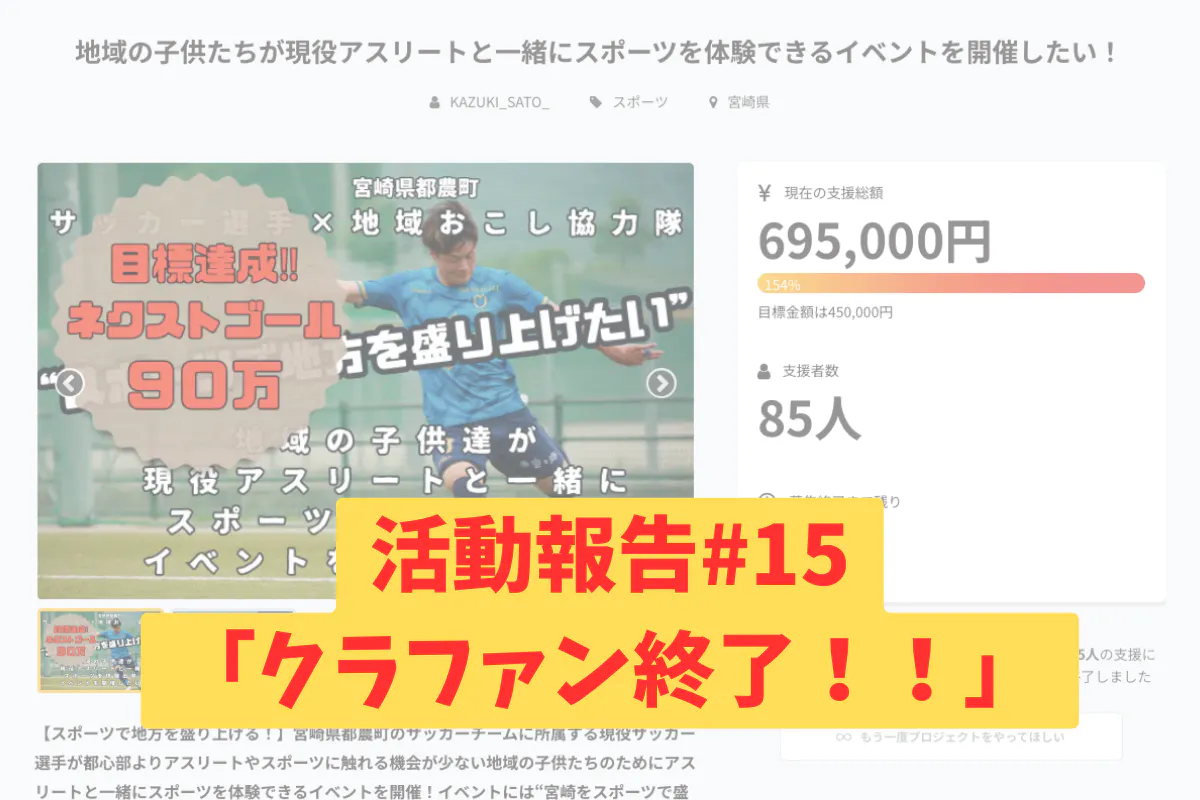 2024/03/02 22:11支援者数 85人金額 ¥695,000達成率 154%1/20から公開したクラウドファンディングが終了しました!ネクストゴール達成とはなりませんでしたが、目標金額を大きく越える結果となりました!!改めてご支援、拡散して頂いた皆さまに心よりお礼申し上げます!このプロジェクトの目標である地域の子供を対象にしたスポーツイベントの開催も無事に終わりました!ただ、ネクストゴールの際にも言いましたが、このプロジェクトの目標は今回のスポーツイベントでしたが目的は更に先にあります!このプロジェクトに満足する事なく、これからも行動し続けて、1人のサッカー選手として出来る事をピッチ内でもピッチ外でも全力でやっていこうと思います!そんな僕をこれからも応援して頂けると嬉しいです!!この度は本当に沢山のご協力ありがとうございました!!P.S.リターン品については順次用意いたします!楽しみにお待ち頂けると嬉しいです!宜しくお願いします!!! もっと見る