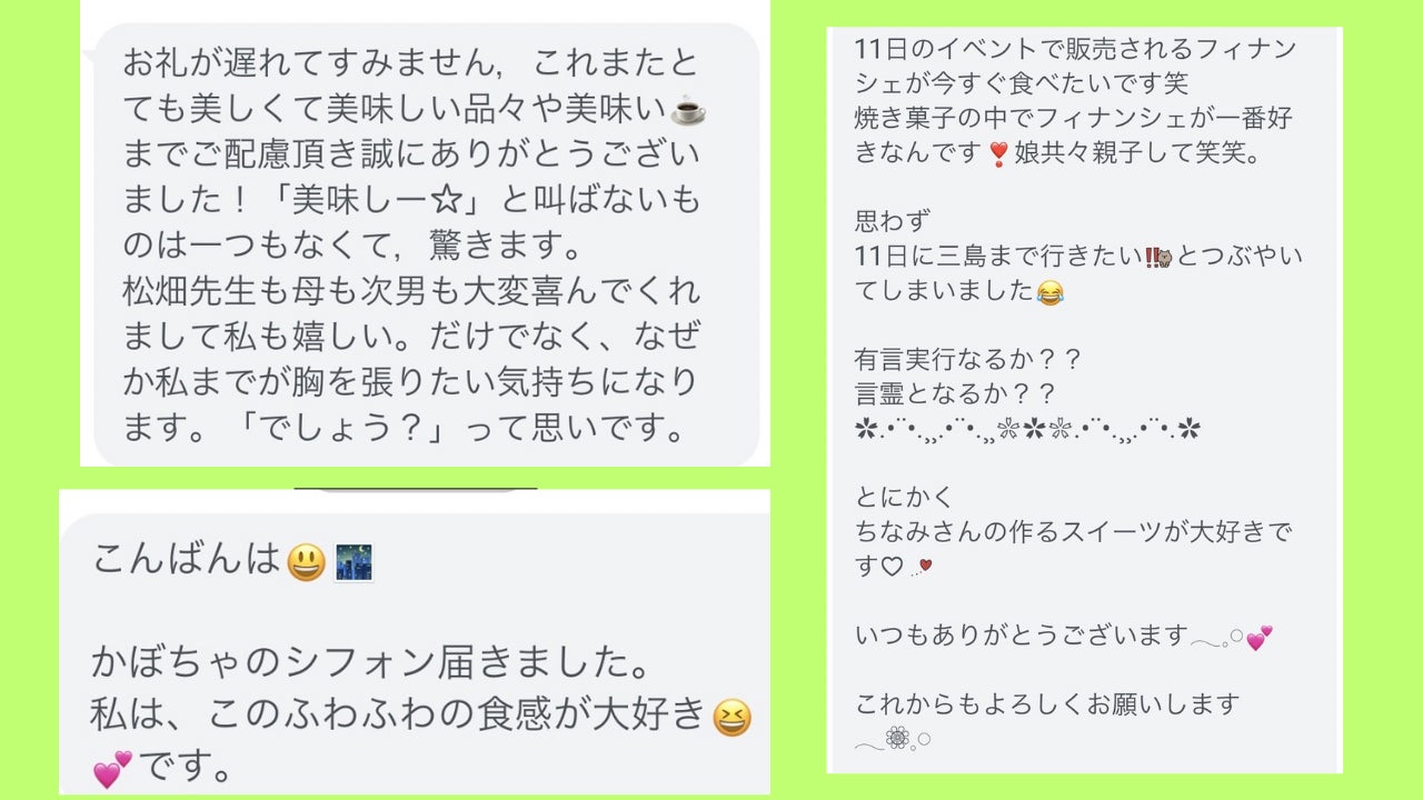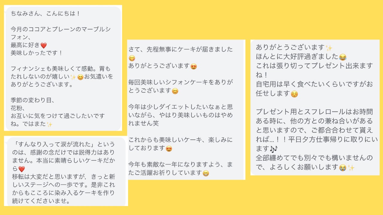 そんな時に、マンスリーシフォン(サブスク)のお客様から「他のスイーツはもう食べられません」とか「智奈美さんのスイーツだから毎月食べたいんです」など、涙が出てくるようなメールやお言葉を頂くのです。