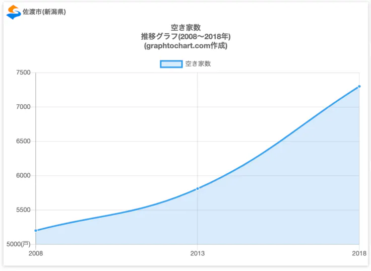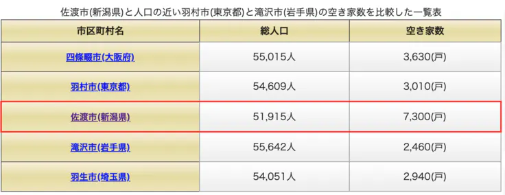 上記の空き家数の比較表をみてみると、佐渡市は、人口の近い羽村市(東京都)よりも空き家数の数値が約4,290も多く、2.425倍も高い。また佐渡市は滝沢市(岩手県)よりも空き家数の数値が約4,840も多く、2.967倍も高いという結果となっています。