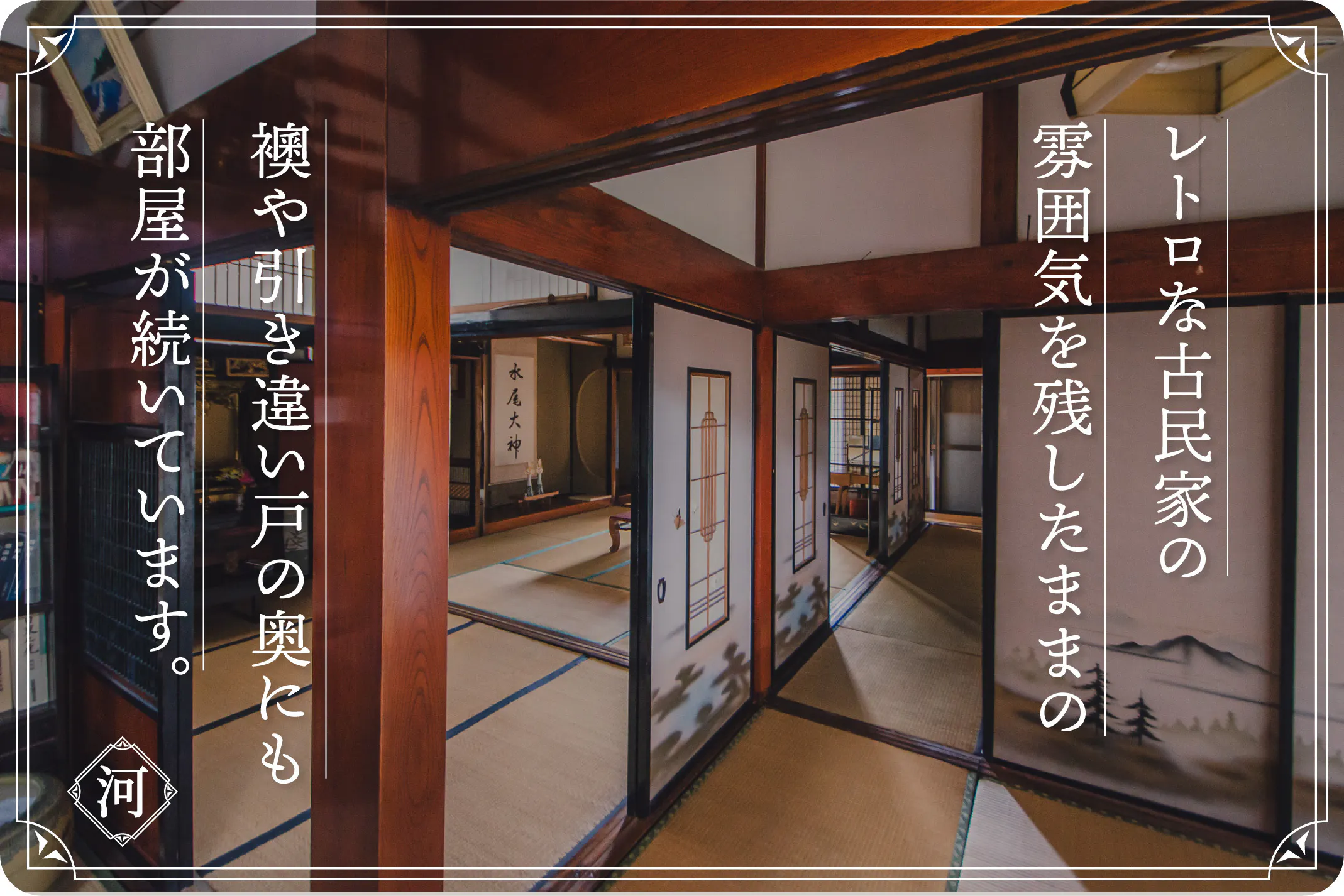 玄関引き戸を開けると目の前に広がる圧倒的迫力のエントランスホール。昔ながらの振り子時計や古い調度品、筆文字の額縁など、当時残されたままの姿で古き良き時代を表現しています。畳をめくると姿を現す囲炉裏を活かし、昔の暮らしを体験できる空間となります。