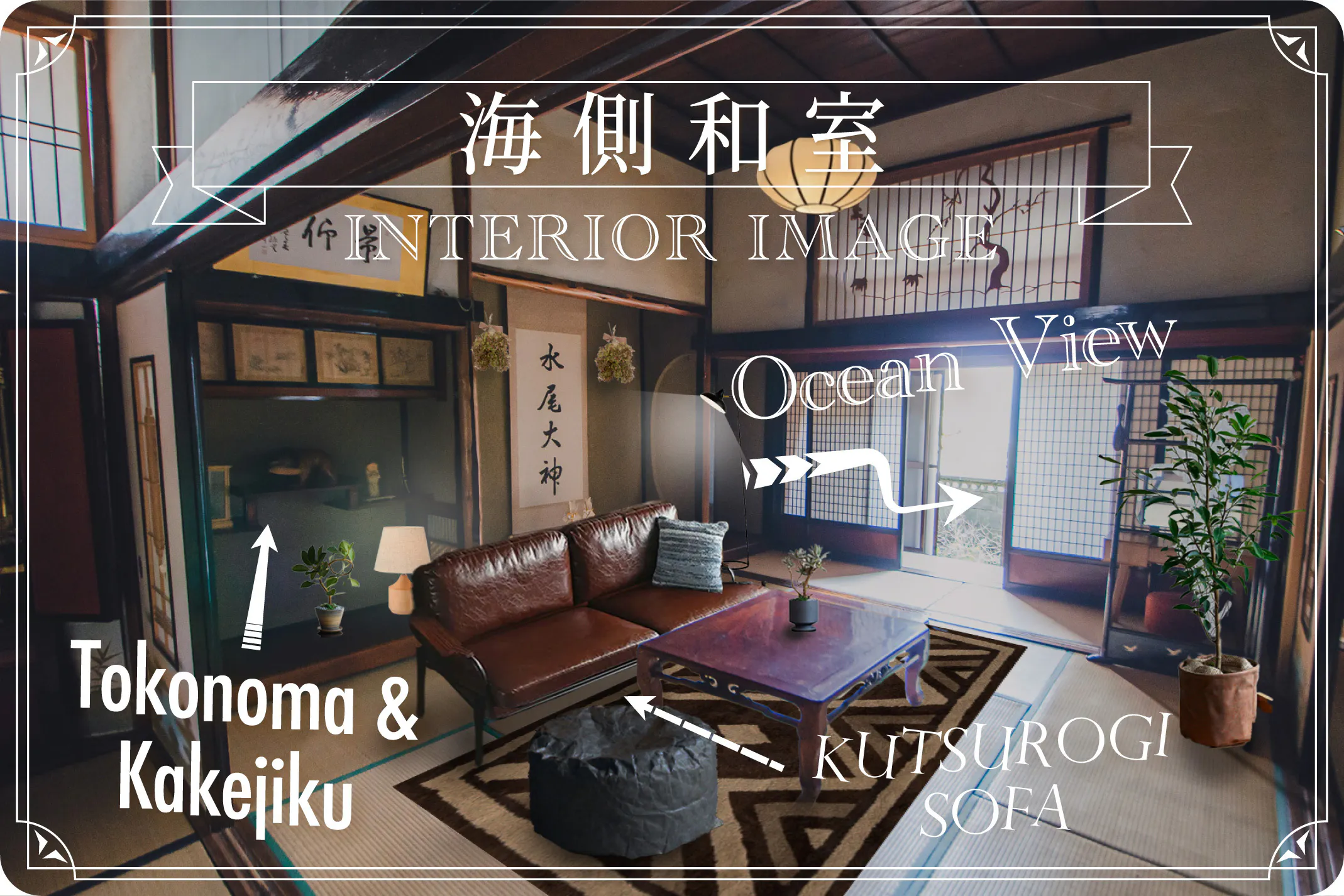 海側の一番広い和室をメインの客室とし、異国情緒漂うラグやグリーンも合わせることで和洋折衷な堅苦しくない雰囲気で旅行者の疲れを癒します。ゆったりできるソファと丈夫なタイベック性ビーズクッションなのでペットとも安心してゆっくりとお寛ぎいただけます。